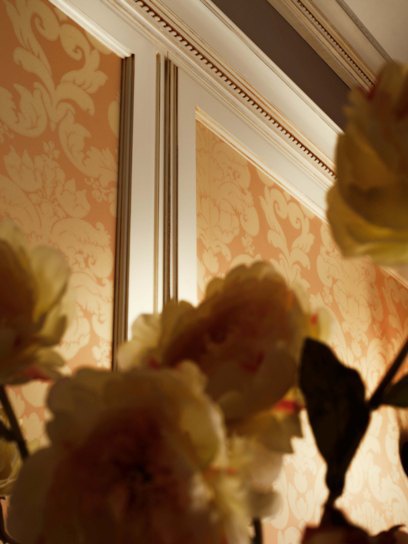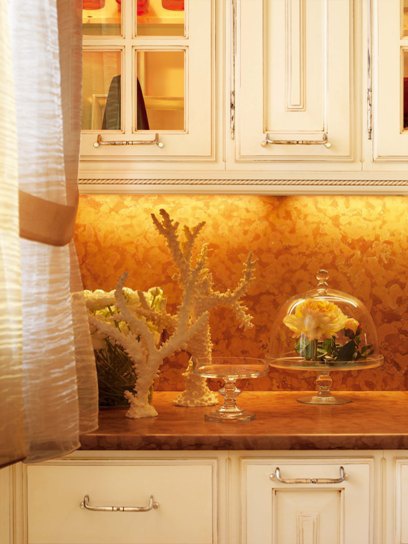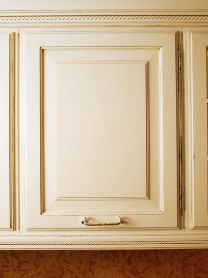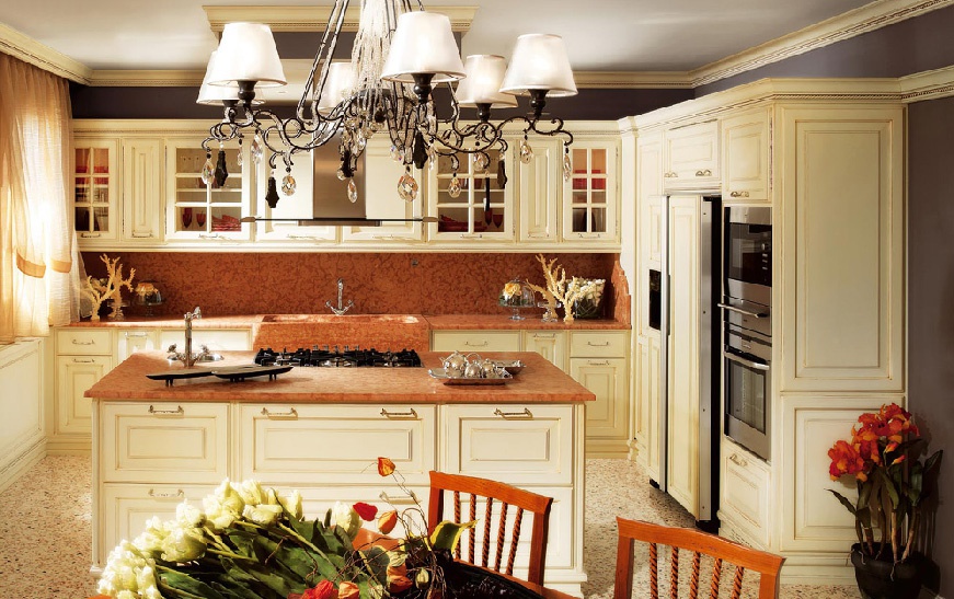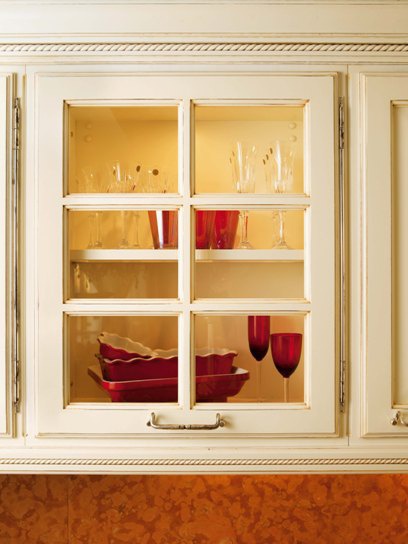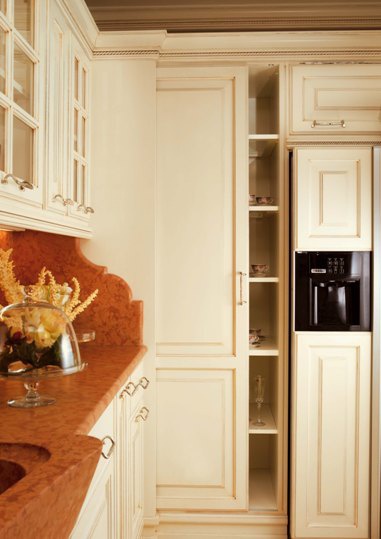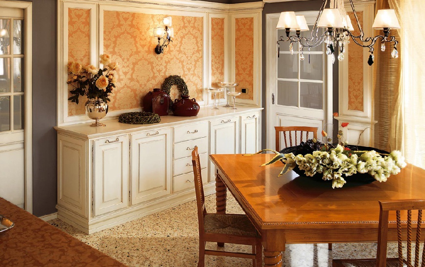 Kitchen Maison Classique from the Italian manufacturer Brummel, collection Maison Classique. Kitchen in a classic style. The frame is made of solid wood in white lacquer finish. Facades are blank and glazed. Handles made of metal. The design complements the hand-carved.