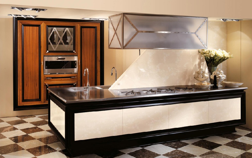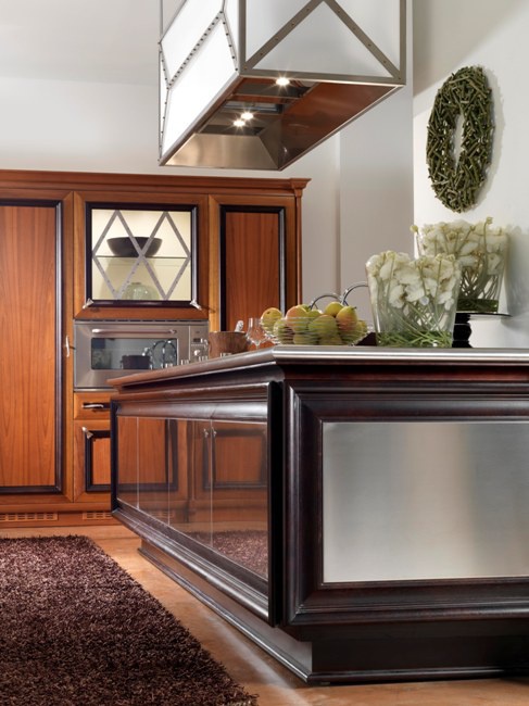 Kitchen Marmola from the Italian manufacturer Brummel, a collection of Marmola. Kitchen in a classic style. The frame is made from solid wood. Facades are blank and glazed. Handles made of metal. The working area is of stainless steel. There is an internal backlight modules.
