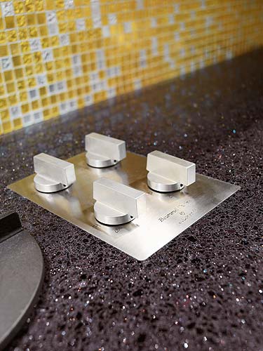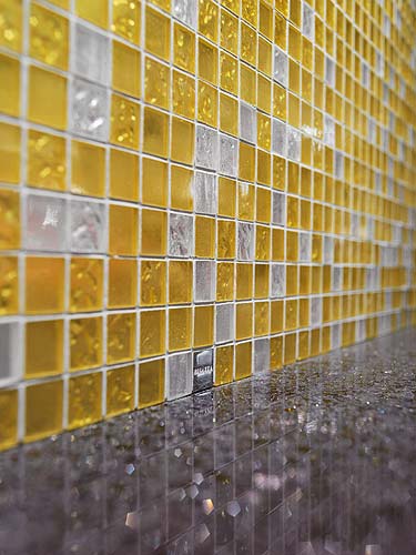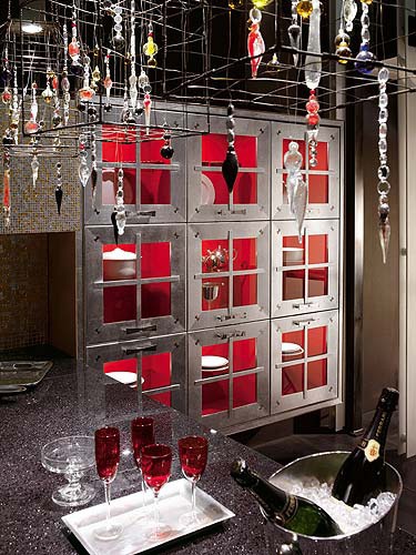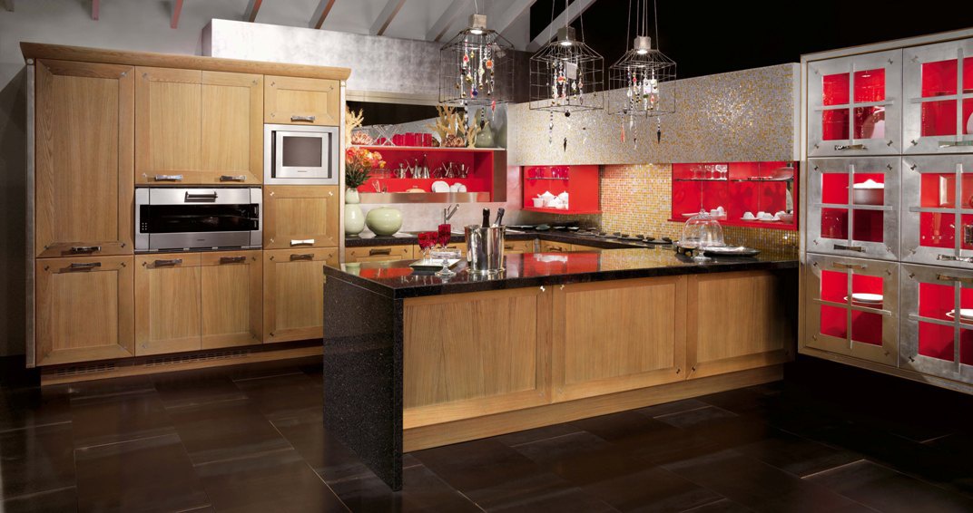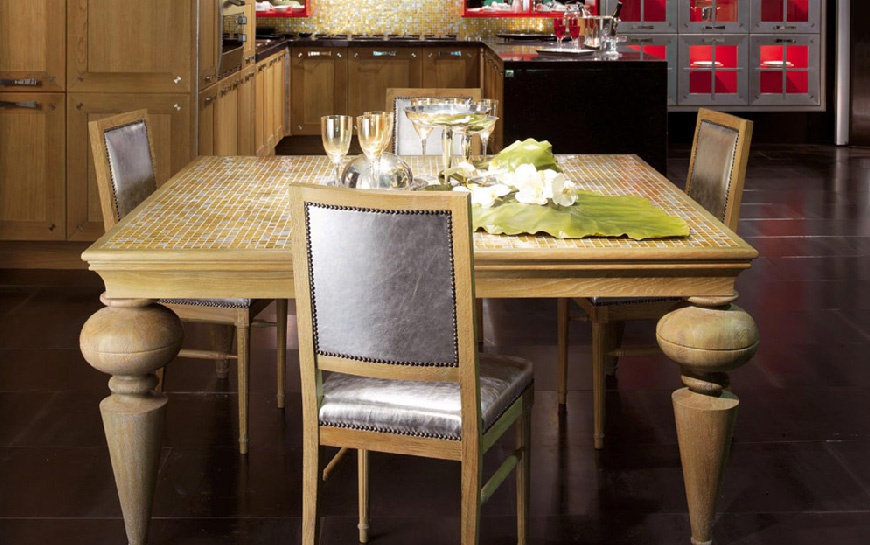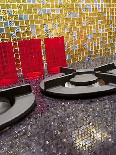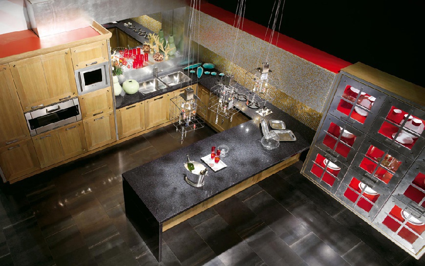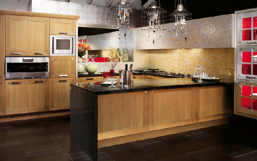 Papillon kitchen by Italian manufacturer Brummel, collection Papillon. The frame is made from solid wood. Facades are blank, glazed and stainless steel. Handles made of metal. The working area of black marble. There is an internal backlight modules. The design complements the glass mosaic.