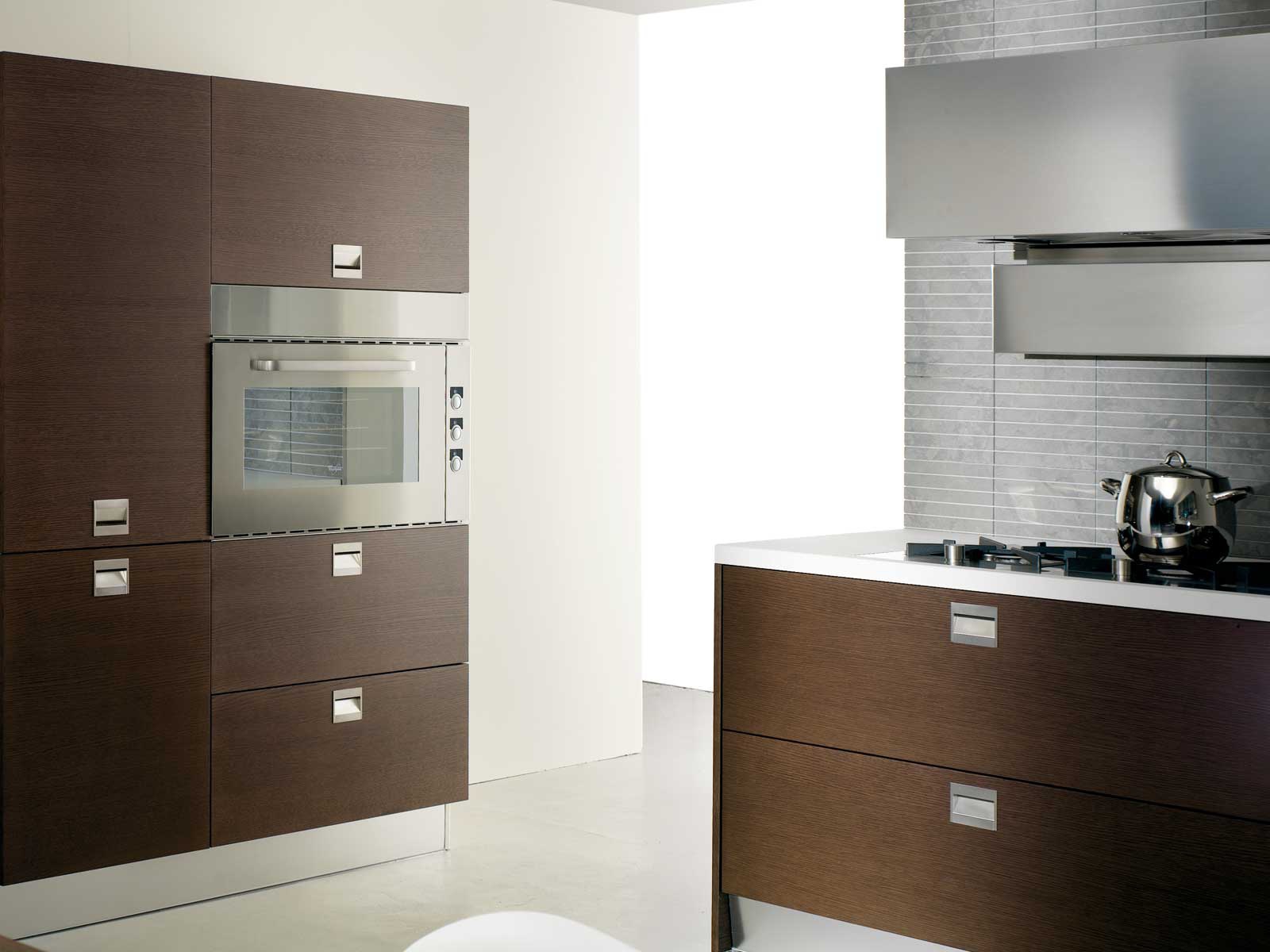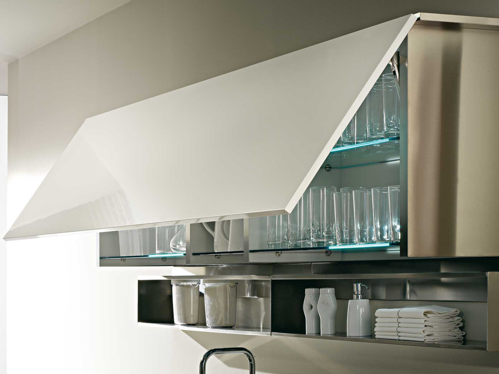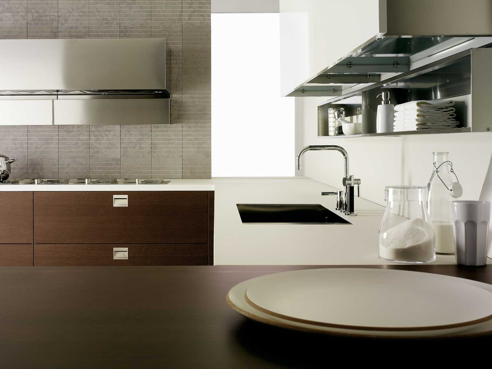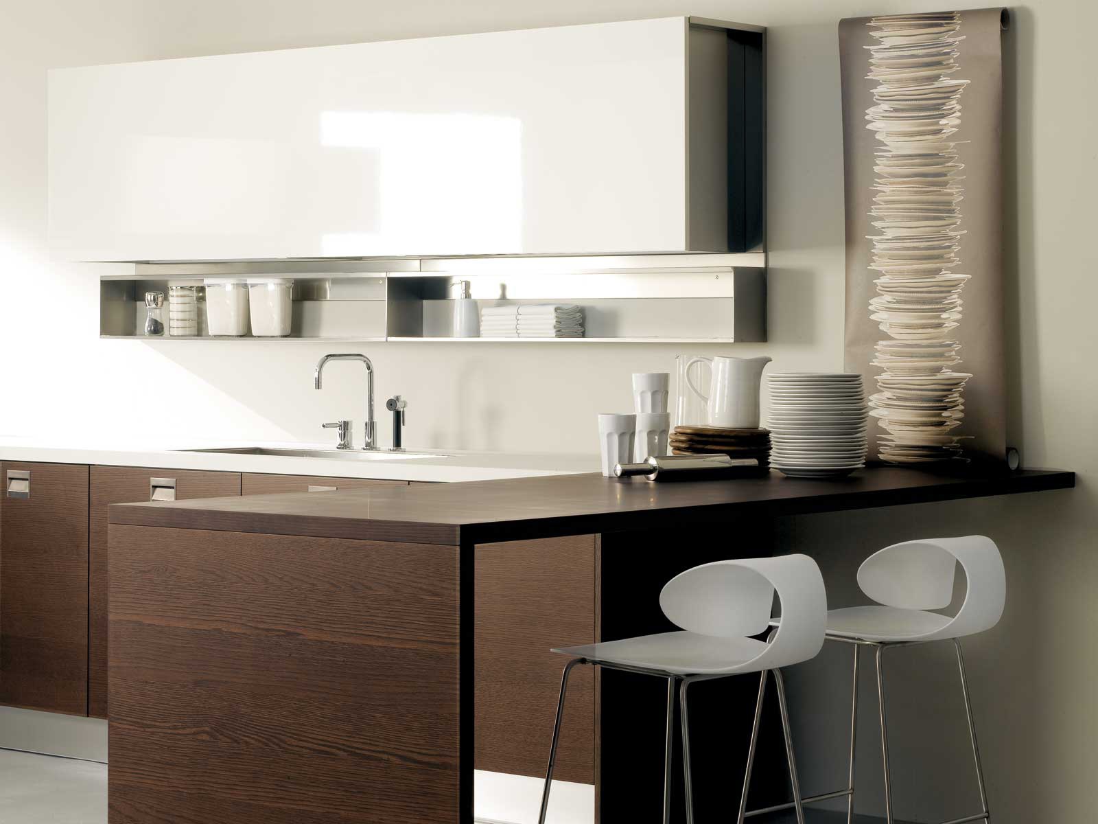 Basic kitchen set from the Italian manufacturer Rossana, kitchen collections Basic. The kitchen is designed in harmony with modern, dynamic lifestyles. Many customization options allows different ways to interpret the kitchen space, creating a bright individual solutions. The frame is made from solid wood in the finishes Matt or glossy lacquer. The fronts and handles made of stainless steel.