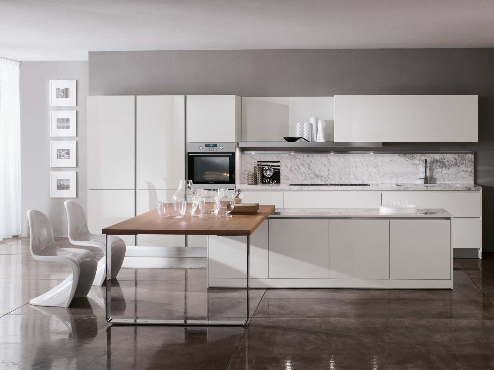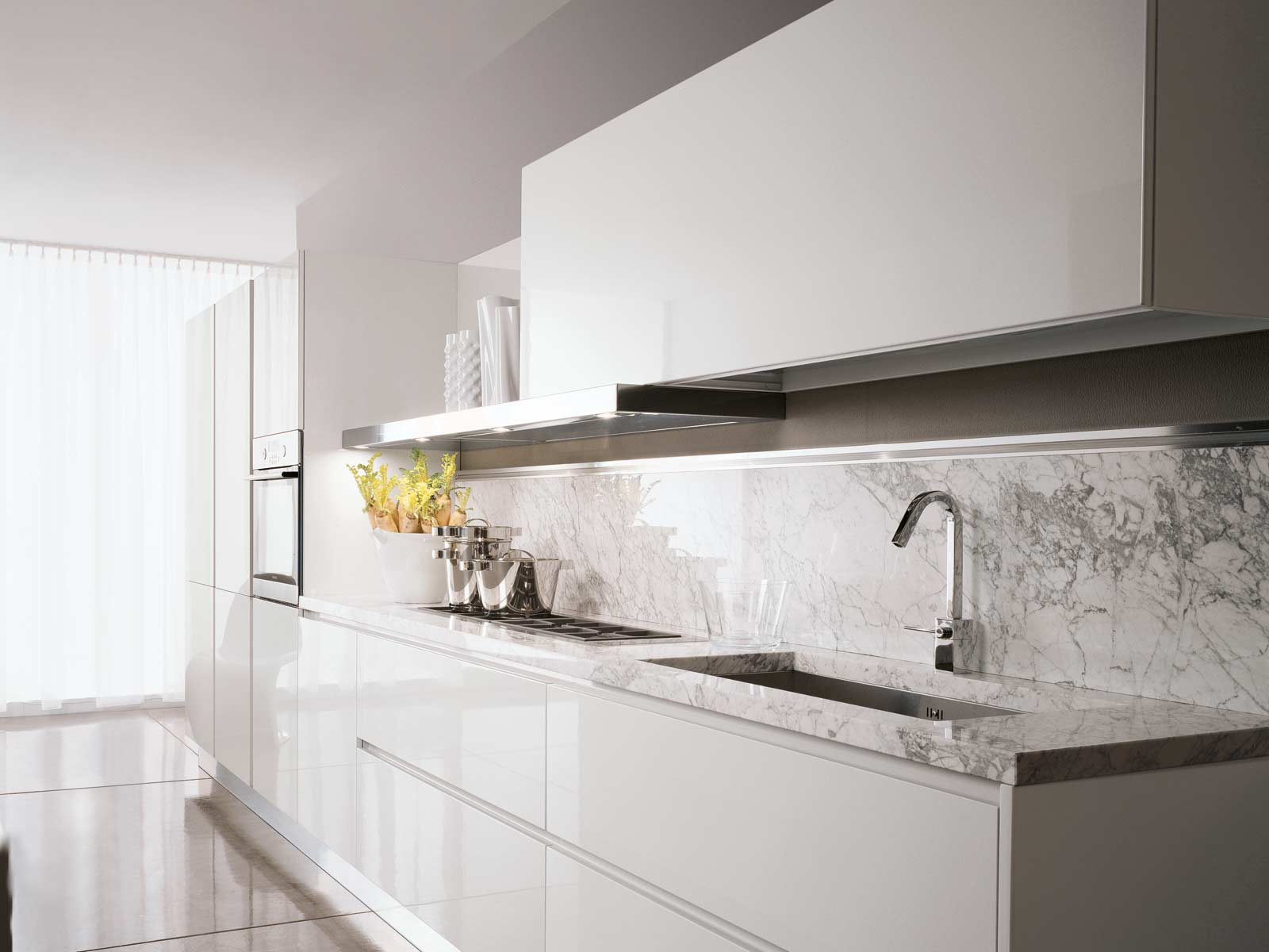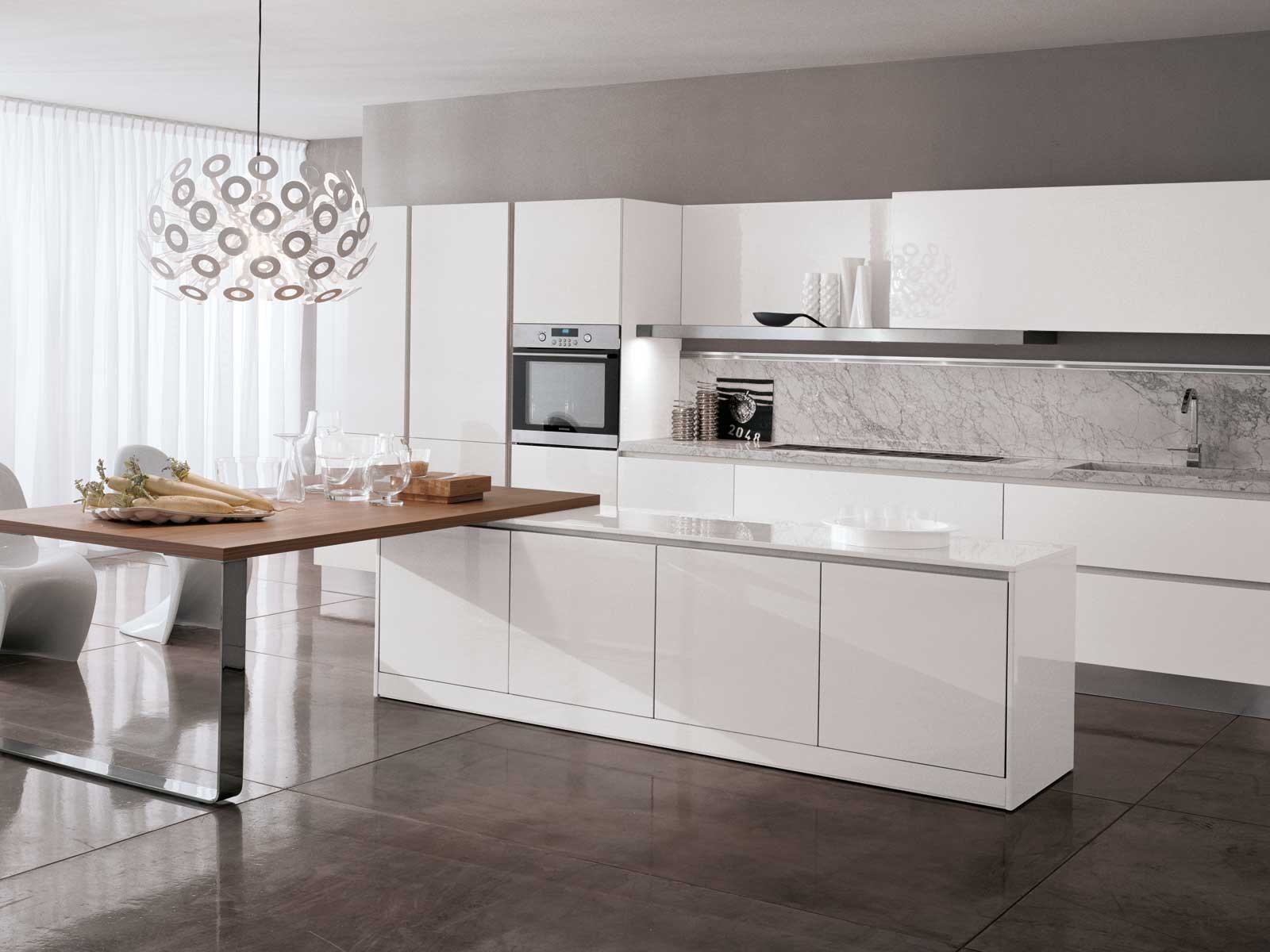 Kitchen Boston-Devon from the Italian manufacturer Rossana, kitchen collections Boston-Devon. The materials used and structural elements allow the kitchen beyond the established views. The frame is made of metal and wood, finished off in high gloss lacquered white. Kitchen completed with long hanging shelf that looks weightless in this design. The working area is stainless steel. Style kitchen Boston-Devon is characterized by mobility and a strong personality, suitable for people with a fresh perspective and exquisite taste.