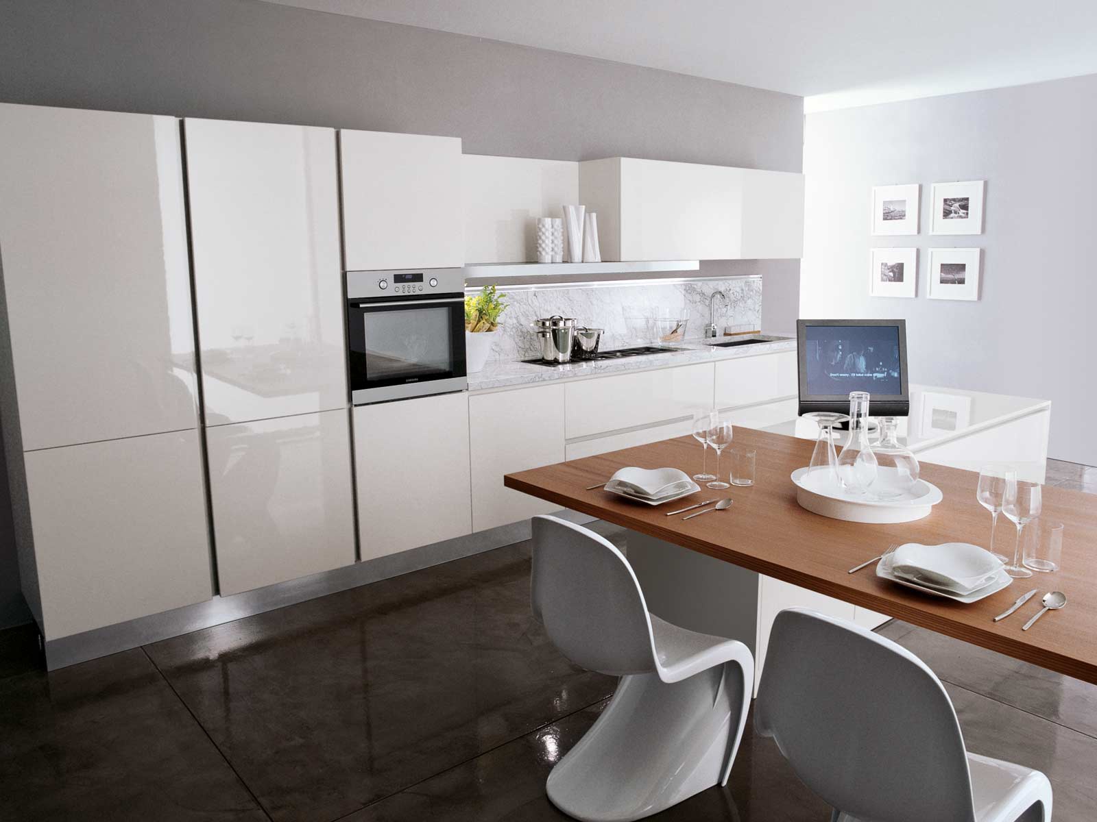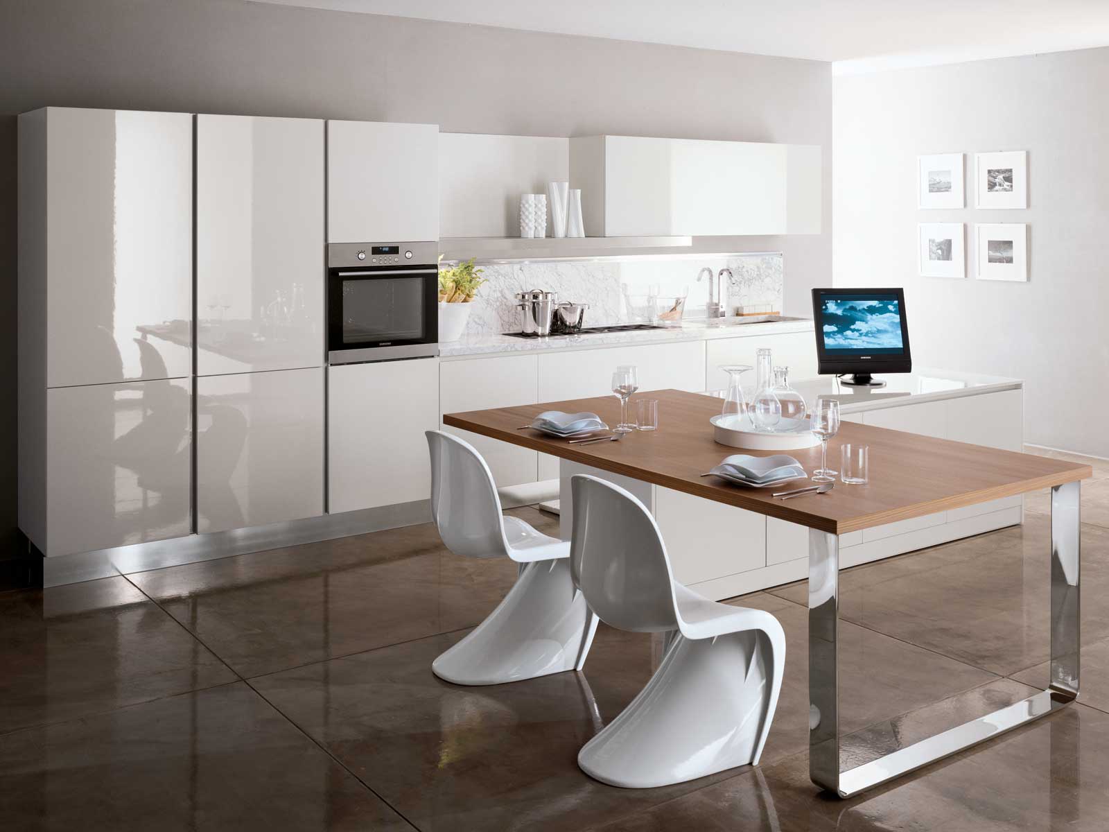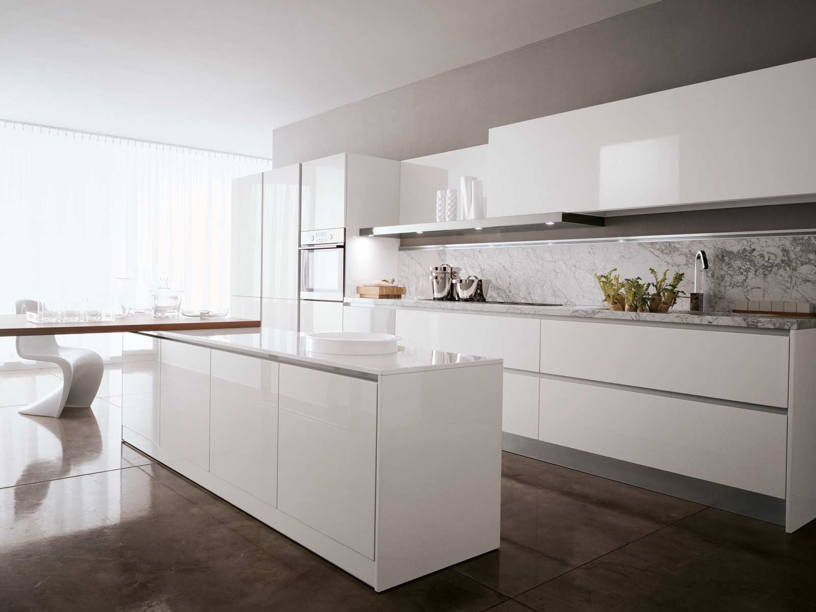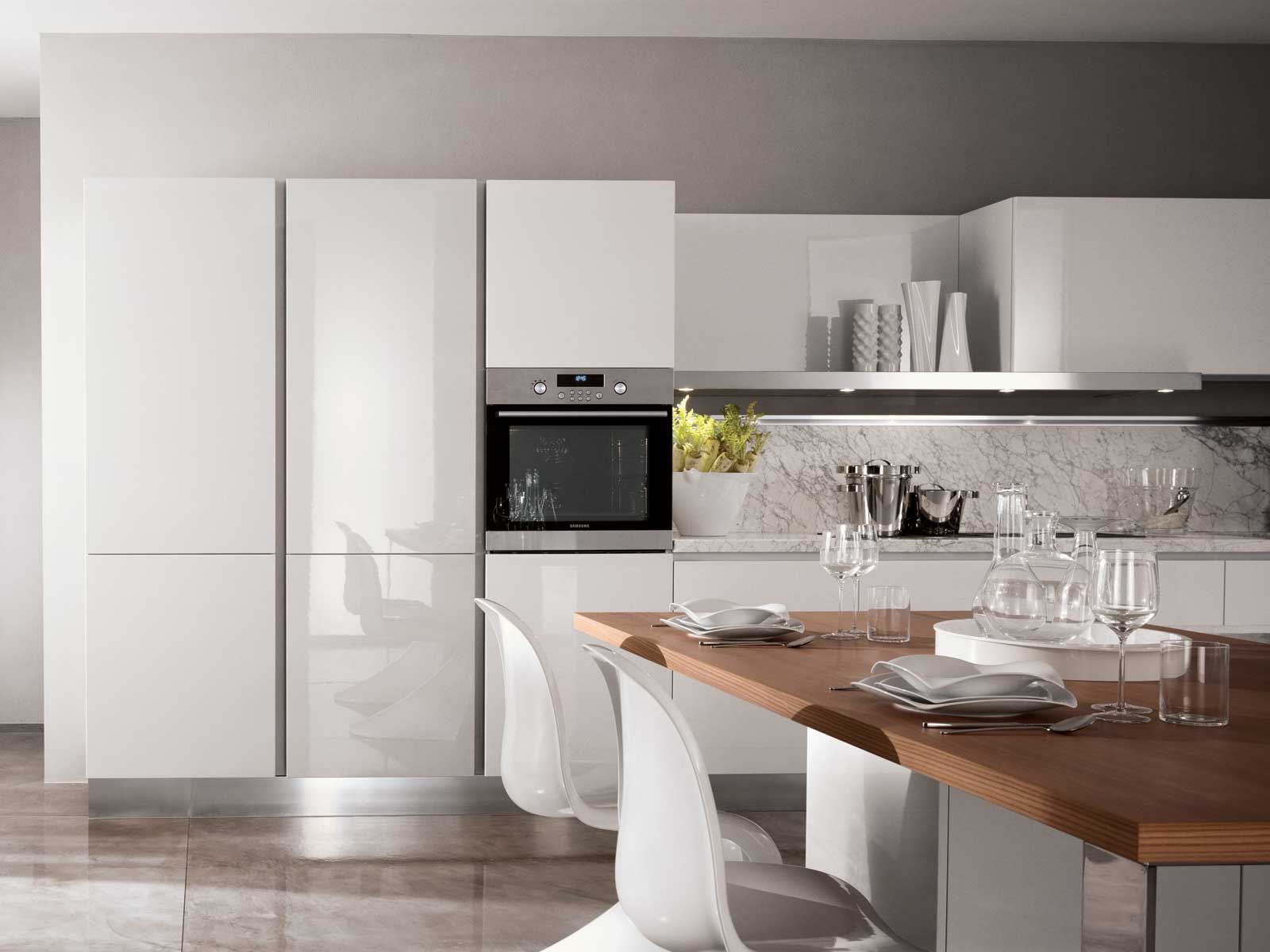 Kitchen Boston-Devon from the Italian manufacturer Rossana, kitchen collections Boston-Devon. The materials used and structural elements allow the kitchen beyond the established views. The frame is made of metal and wood, finished off in high gloss lacquered white. Kitchen completed with long hanging shelf that looks weightless in this design. The working area is stainless steel. Style kitchen Boston-Devon is characterized by mobility and a strong personality, suitable for people with a fresh perspective and exquisite taste.