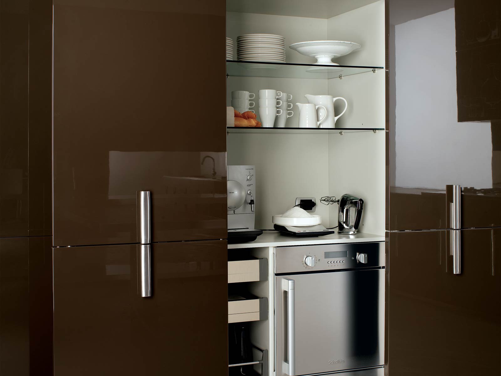 Etna kitchen set from the Italian manufacturer Rossana from the collection of Etna. The kitchen blends warmth and sensuality of traditional Mediterranean materials, high technology and functionality. The frame is made of solid wood, finished with glossy varnish brown. The working area and handle made of stainless steel. ETNA kitchen is able to easily adapt to limited spaces Metropolitan apartments and to large areas of suburban real estate.