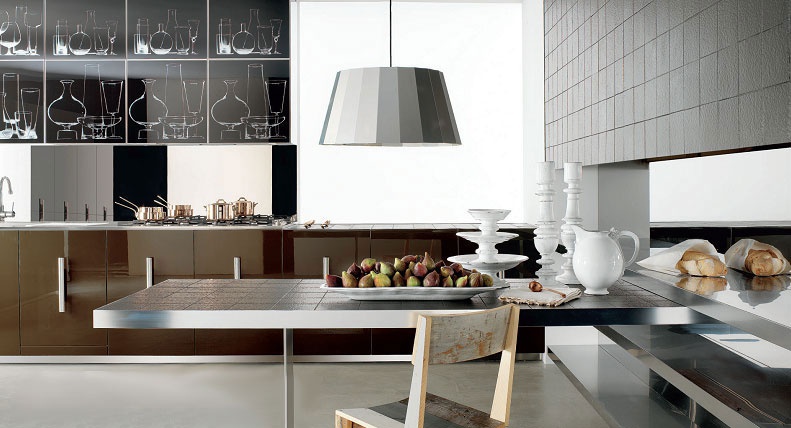 Kitchen Inn from the Italian manufacturer Rossana, kitchen collections Inn. The kitchen design is characterized by solid lines and the extreme volumes. Made of ebony wood, the surface of which is treated with glossy varnish of white color. Worktop in white Corian.