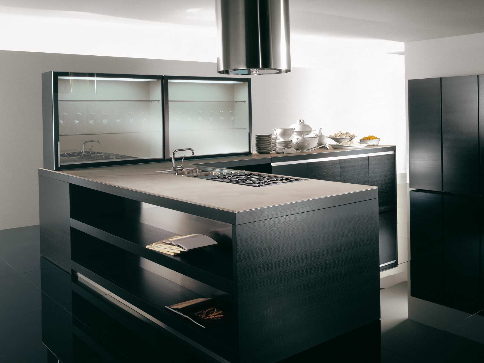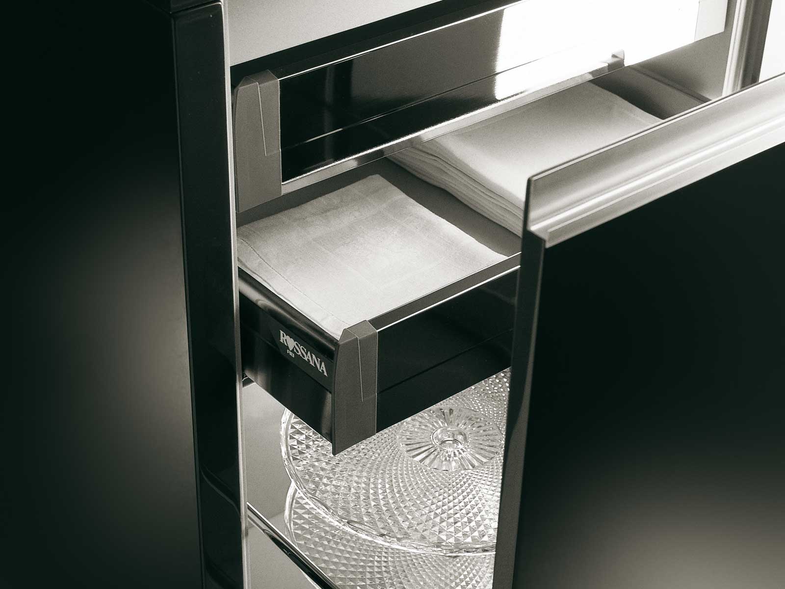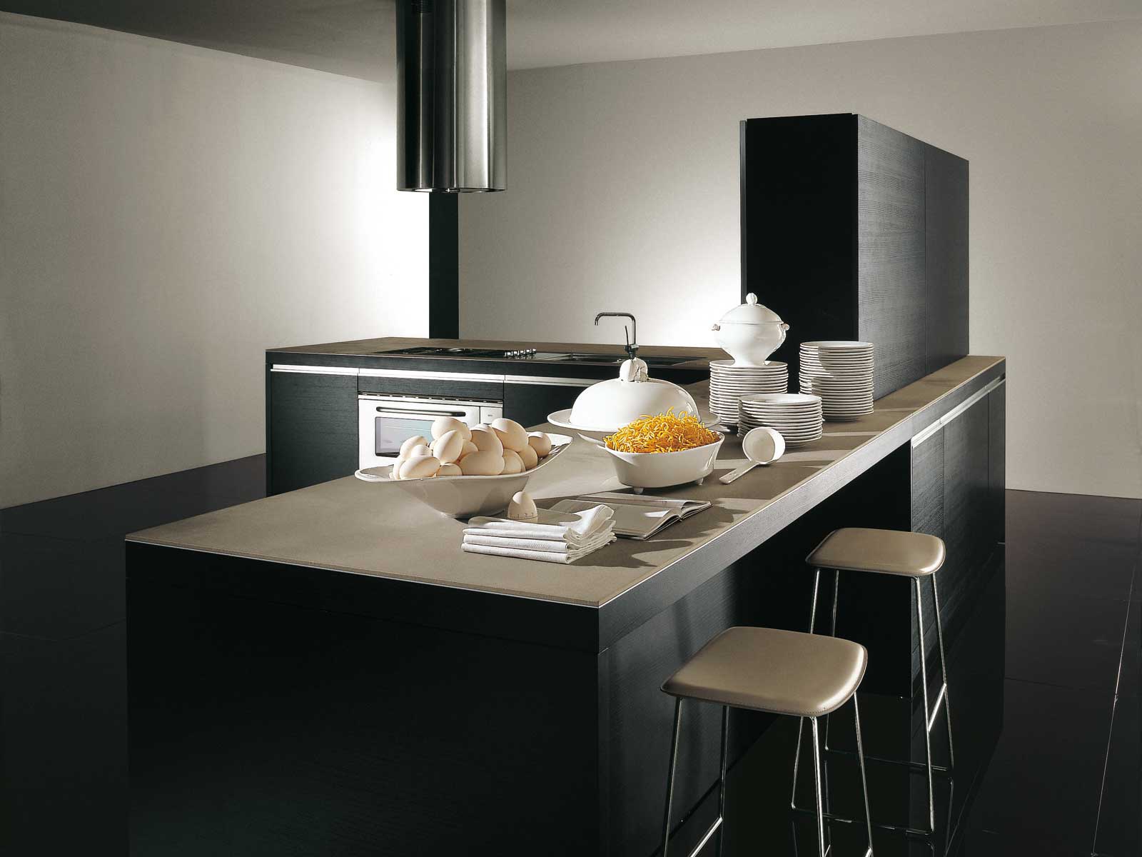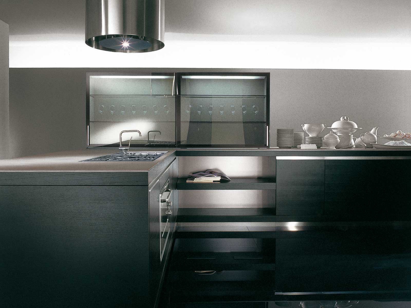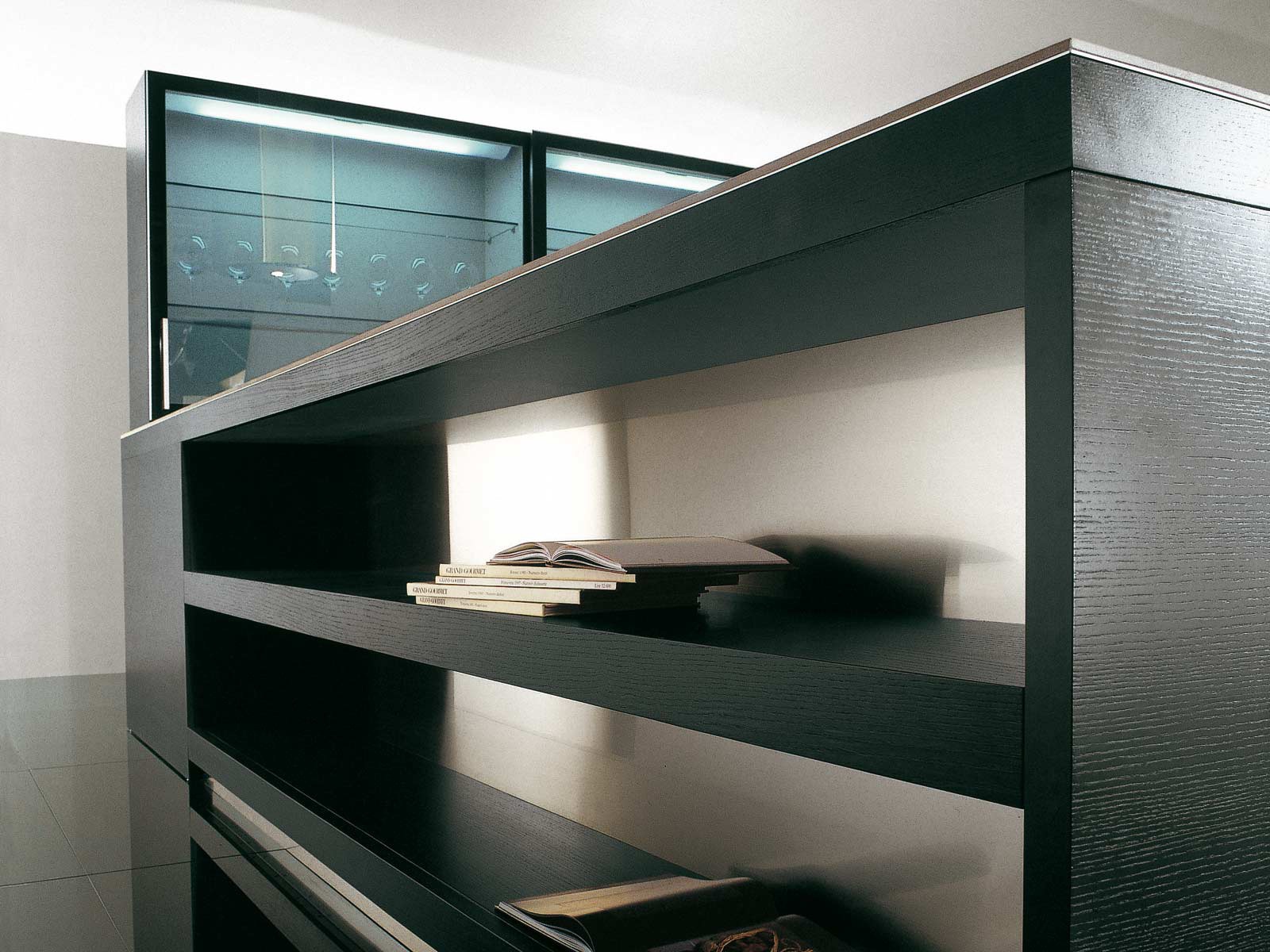 working area: artificial stone the facade: glass frame: MDF the surface: veneer frame : lacquered |