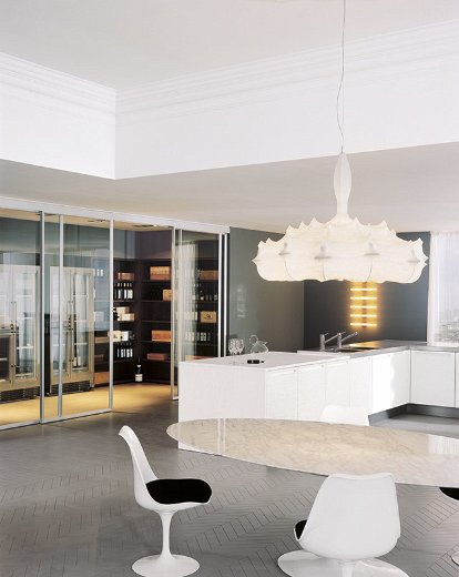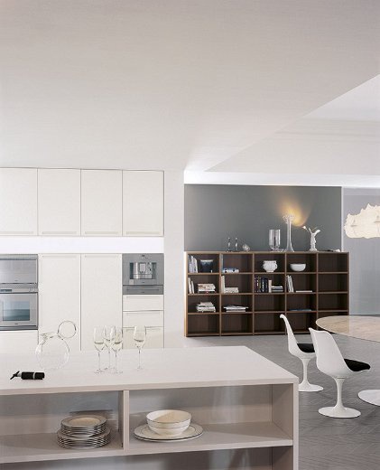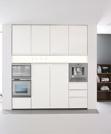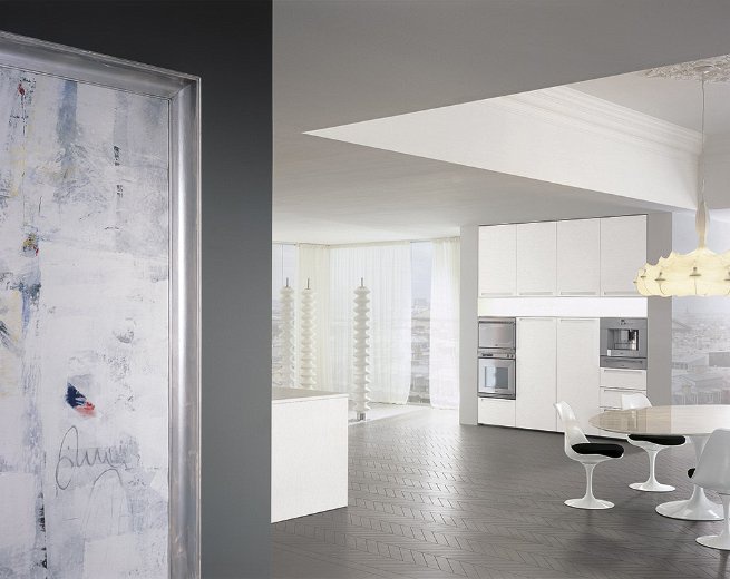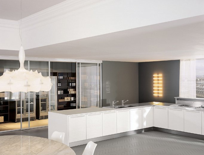 Kitchen set from Essenza Italian manufacturer Comprex from the collection Essenza. The kitchen combines functionality and elegance. Drawers and swing doors without handles. The working area is stainless steel. The frame is made of chipboard class E1 finish options: matte or glossy lacquer in white. Collection is designed for customers who prefer modern lifestyle.