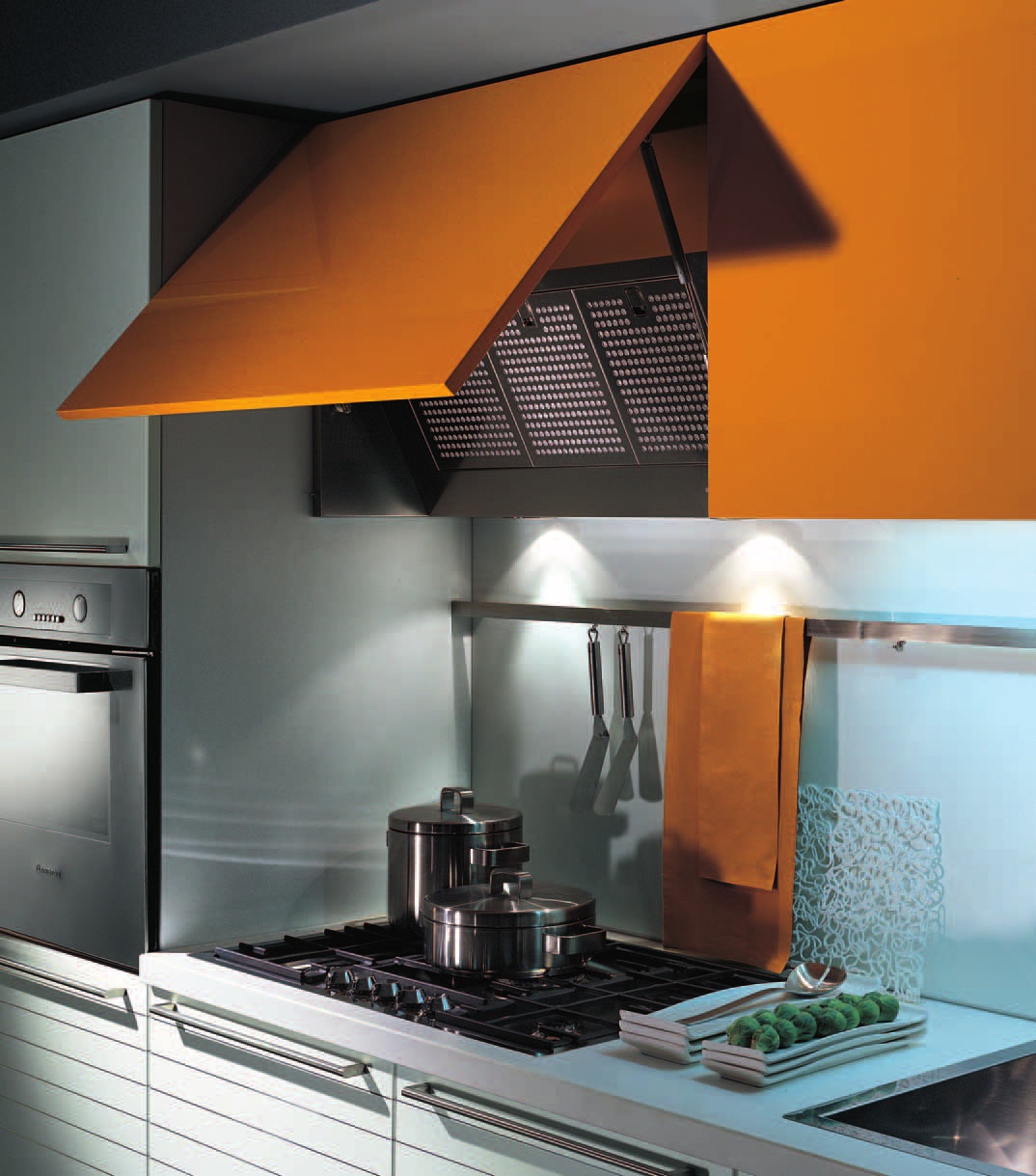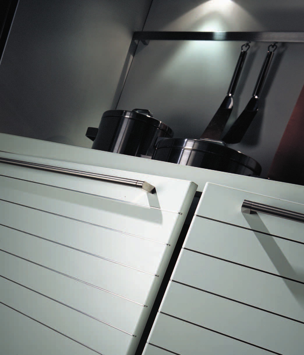 The frame is made of MDF facades in finishing with veneer or lacquer from the catalog of the manufacturer. The decor of the facades are aluminum horizontal streaks. The wall modules are equipped with additional illumination. Hardware shiny or brushed steel. Countertop made of stone or MDF. A model kitchen in a modern style.