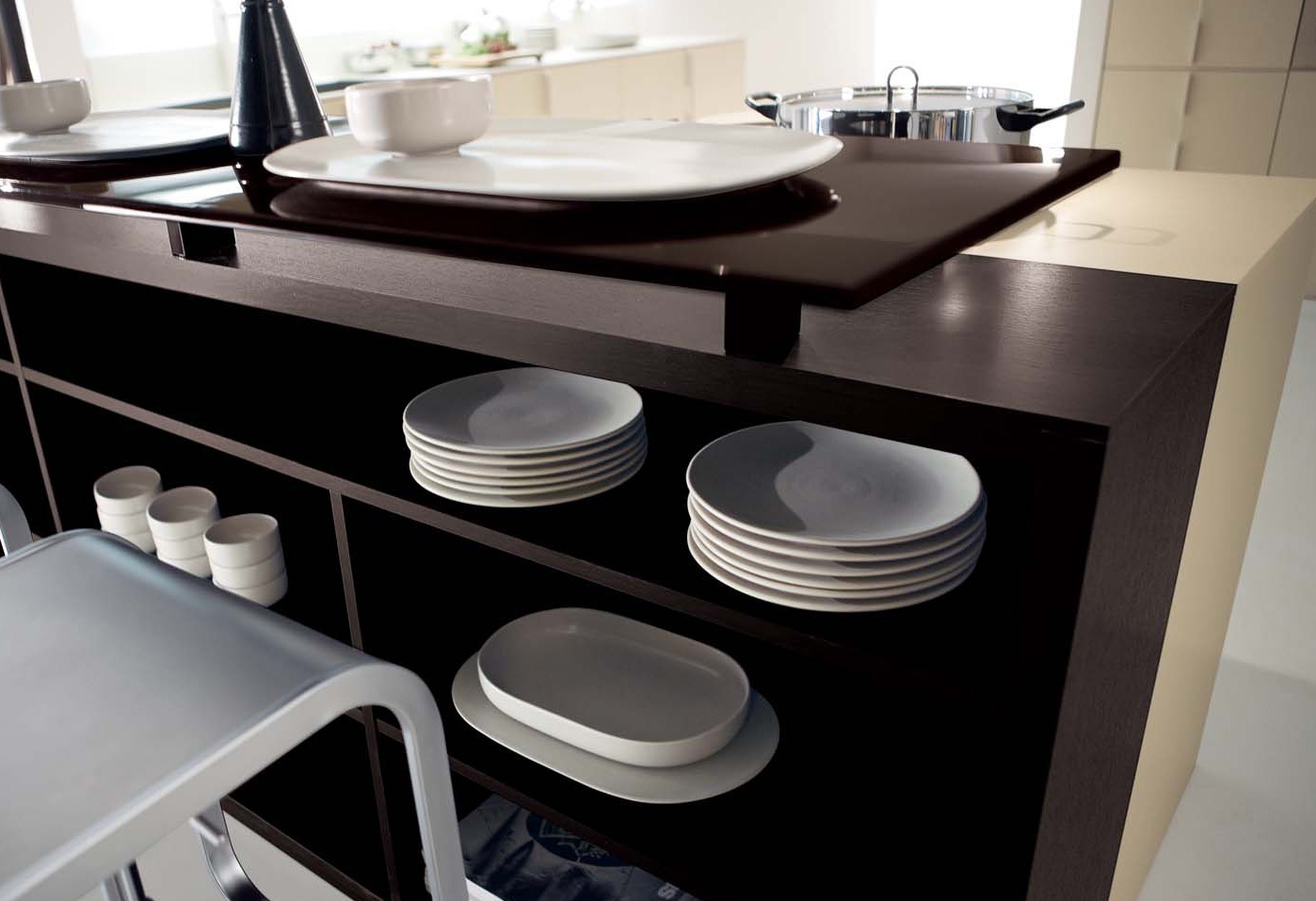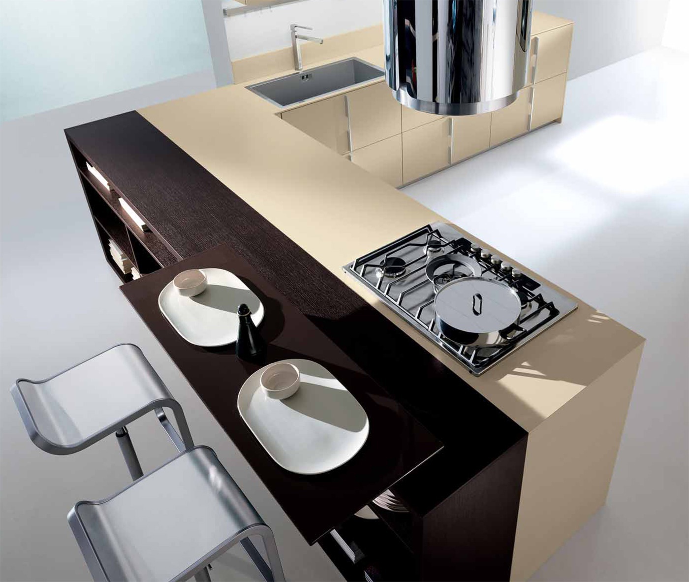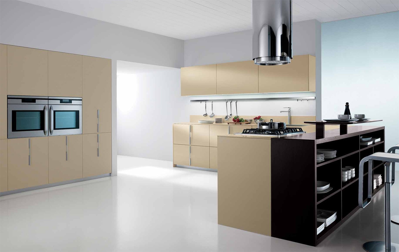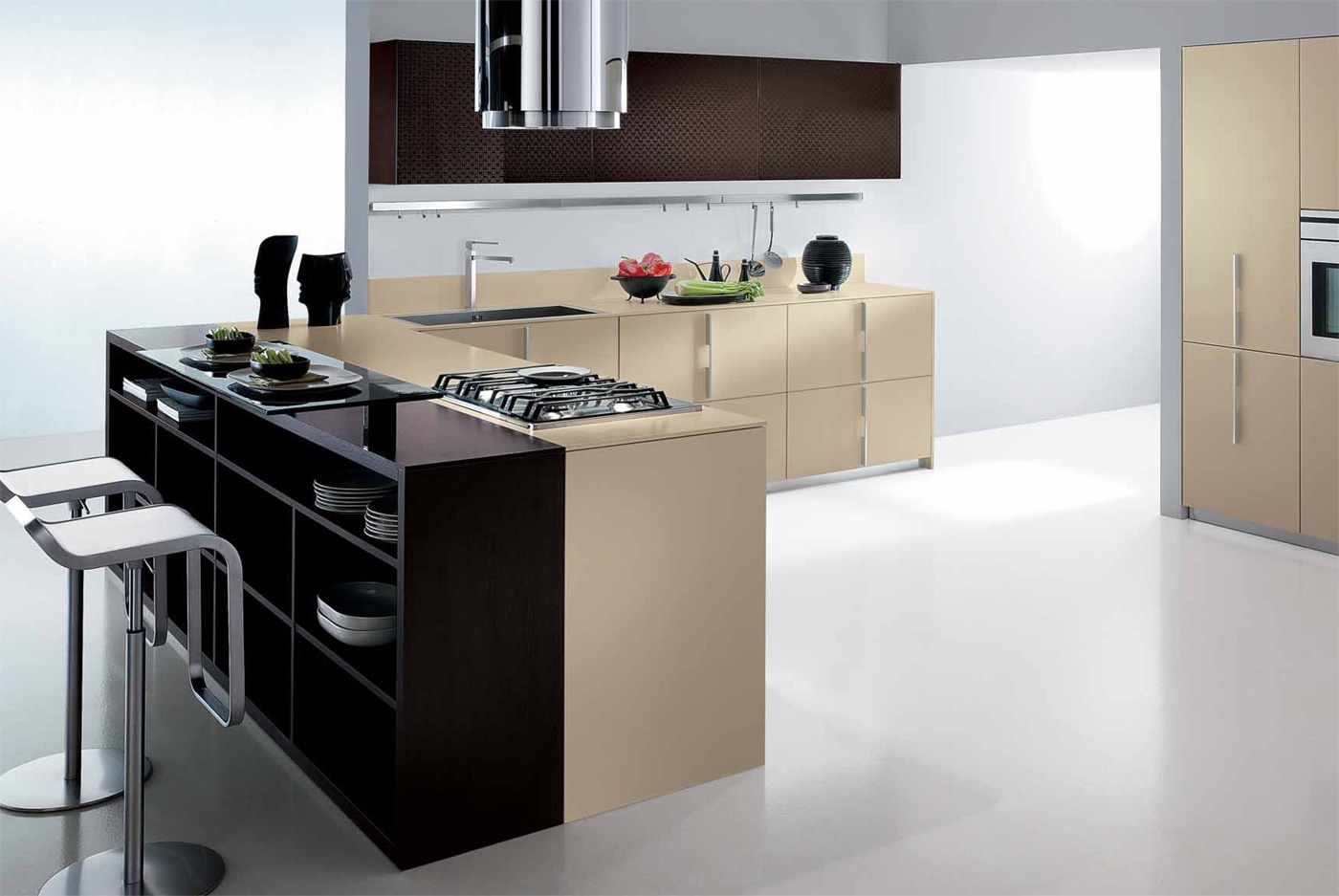 Kitchen cabinets Manhattan from the Italian PROIZVODITELYA Composit. The model is made with island and Breakfast bar. Columns equipped with appliances or are designed as a place for storage. Frame and fronts made of MDF in veneer finish or lacquer from the catalog of the manufacturer. The fronts of wall cabinets and glass shelves. Tabletop can be glass, stone, stainless steel or MDF of your choice.