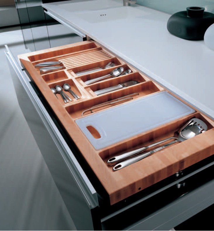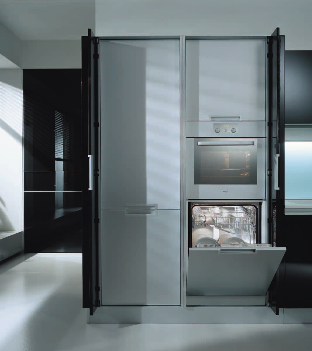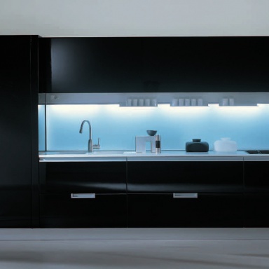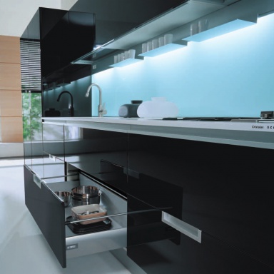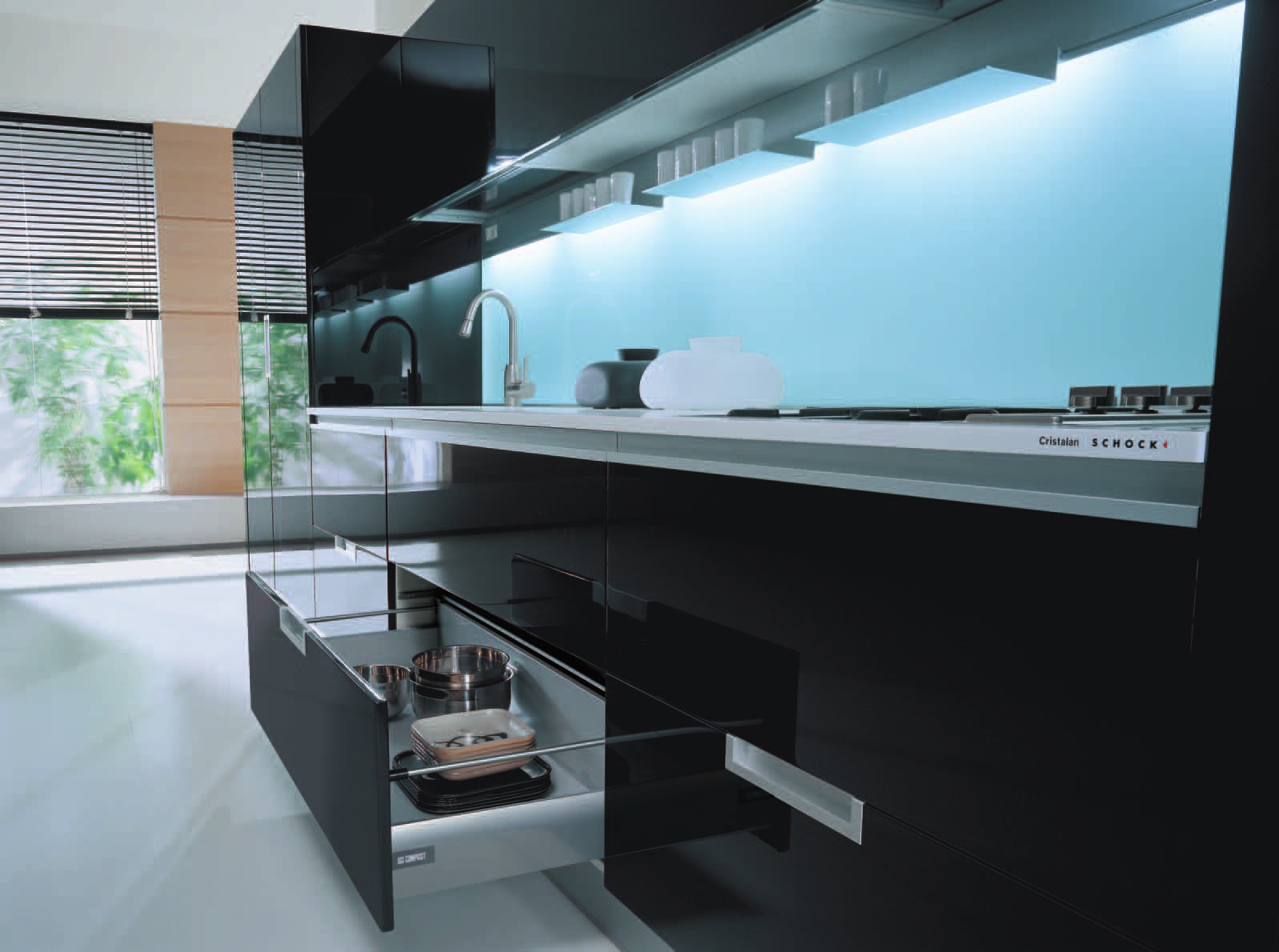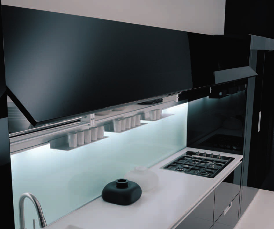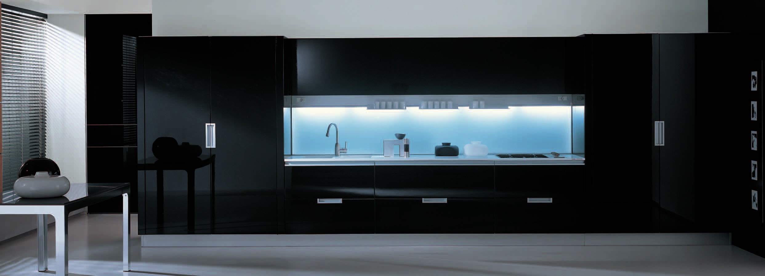 Kitchen Master from the Italian manufacturer Composit. The model is made in black glossy lacquered finish with white lacquered top Cristalan. Completion of the project , selection of finishing modules, and filling enclosures according to the customer to order.