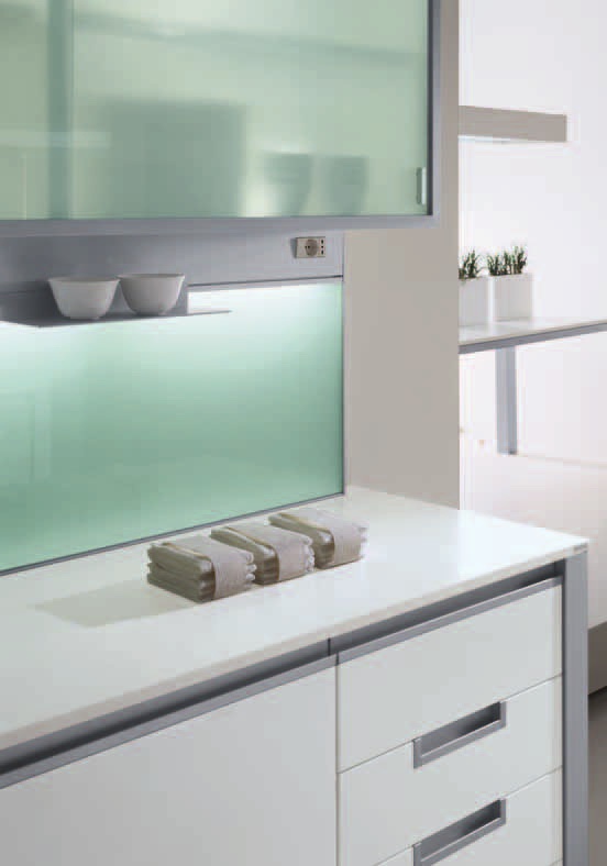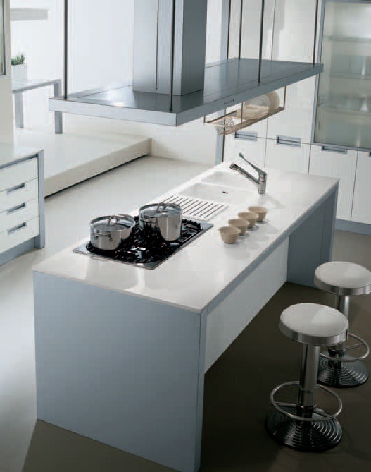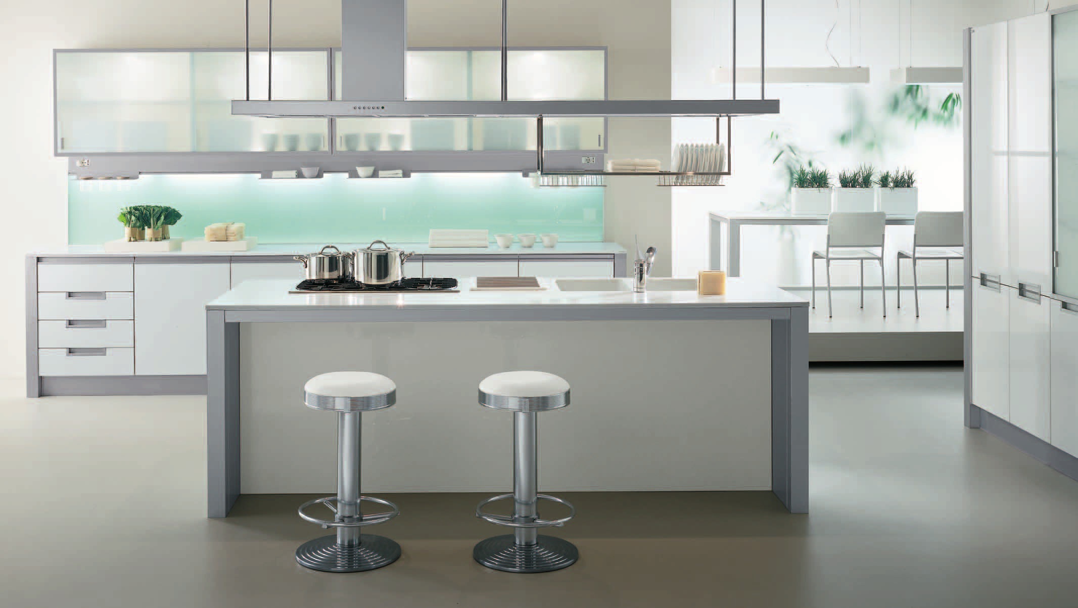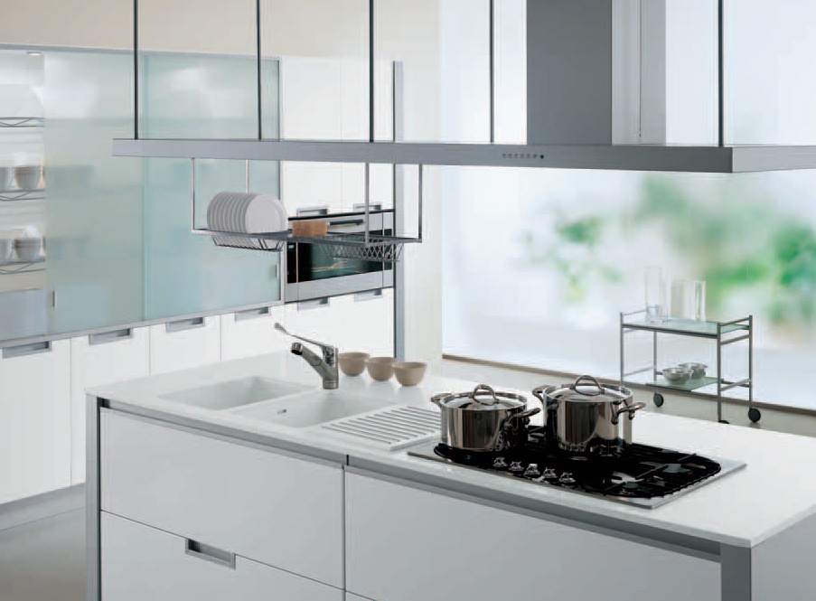 Kitchen Master from the Italian manufacturer Composit. The model is made in glossy white lacquered finish with wall elements with sliding doors in aluminum frame. Aluminum side panels with high and wide canopy or plate RACK are simply the outline of the Central island. Freely positioned island has a wide countertop (W. 255 D. 95) and the possibility of great storage space. Open the hood or pull-out shelf stainless steel complement the kitchen design.