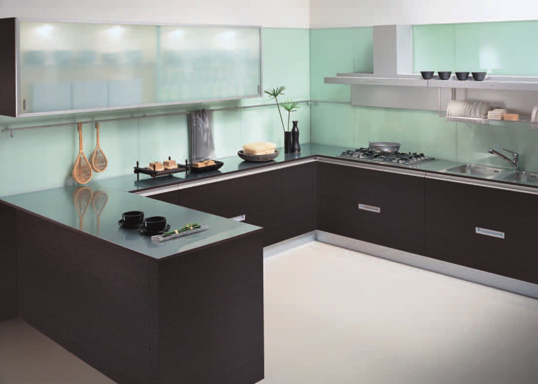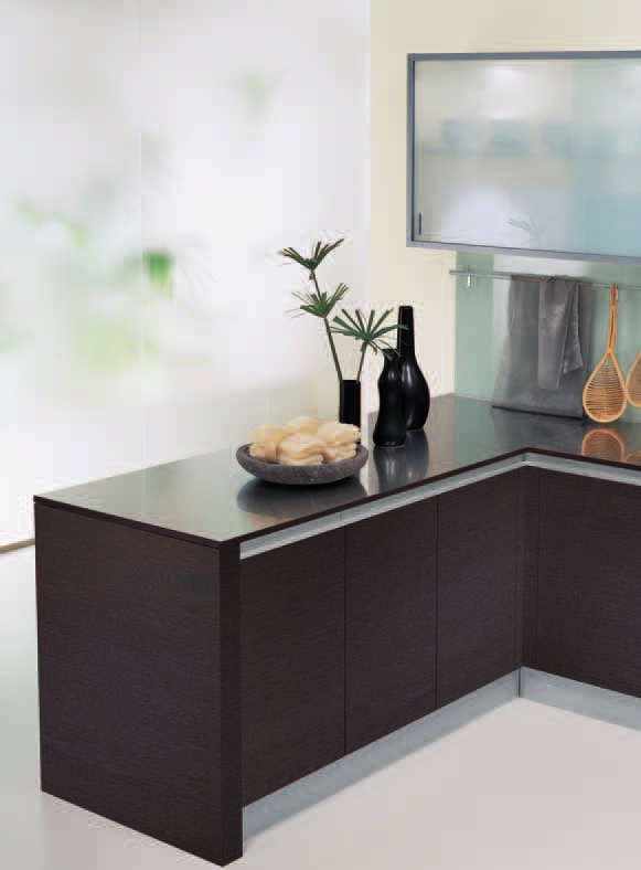 frame: MDF frame glass facades, edge worktops, accessories: stainless steel decoration of facades, Cherkasov: veneer facades, countertop, wall panel: glass |