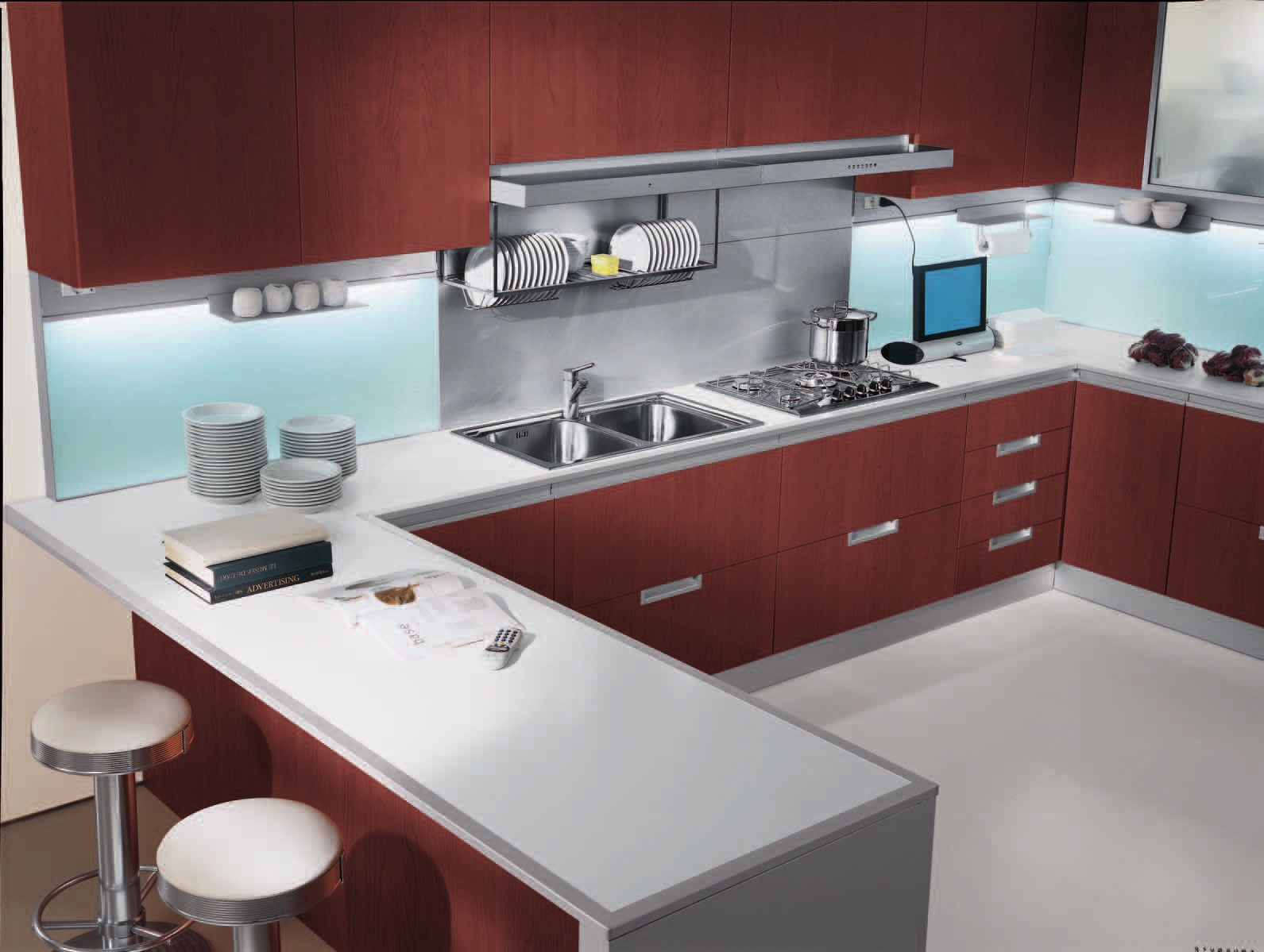 frame: MDF finish: veneer facades, wall panel: Satinato (matte) frame facades, furniture, the edge countertops: aluminum |