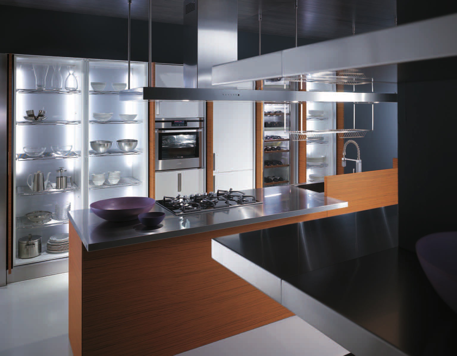 Kitchen Maxima from the Italian manufacturer Composit. Frame and fronts made of MDF, veneer finish or stainless steel panels. Column with integrated appliances. The cabinets are equipped with shelves and sliding baskets. A model kitchen in a modern style.