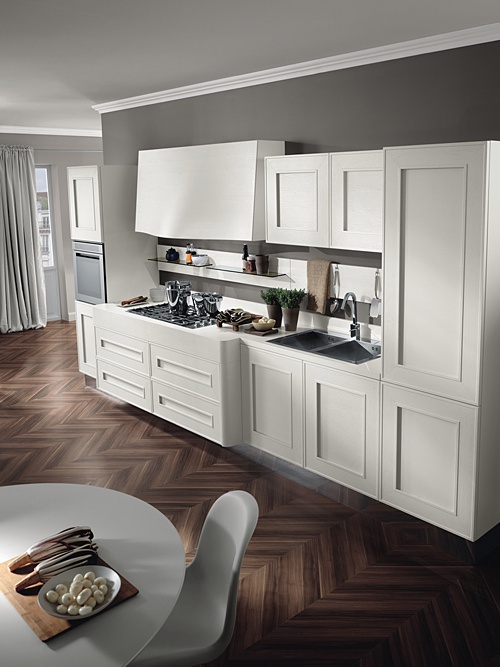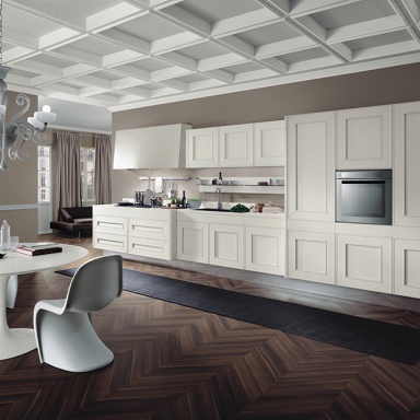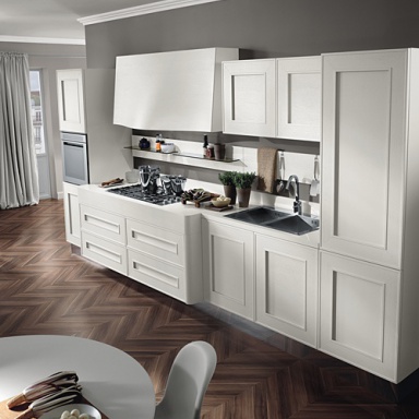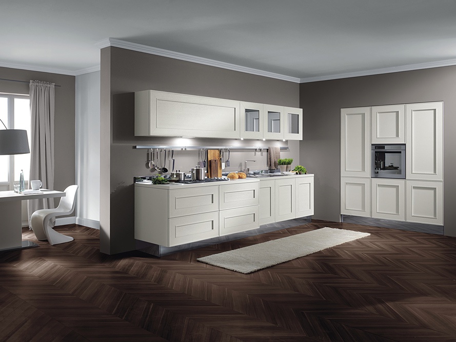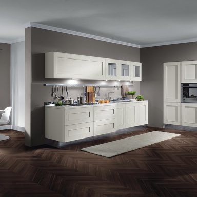 Melograno kitchen by Italian manufacturer Composit. A model kitchen in a modern style. Set is made of MDF and solid wood, veneer finish from manufacturer's catalogue. The surface is lacquered from a range of companies. Countertops. Possible options of stone, steel and glass. Built in appliances according to the customer.