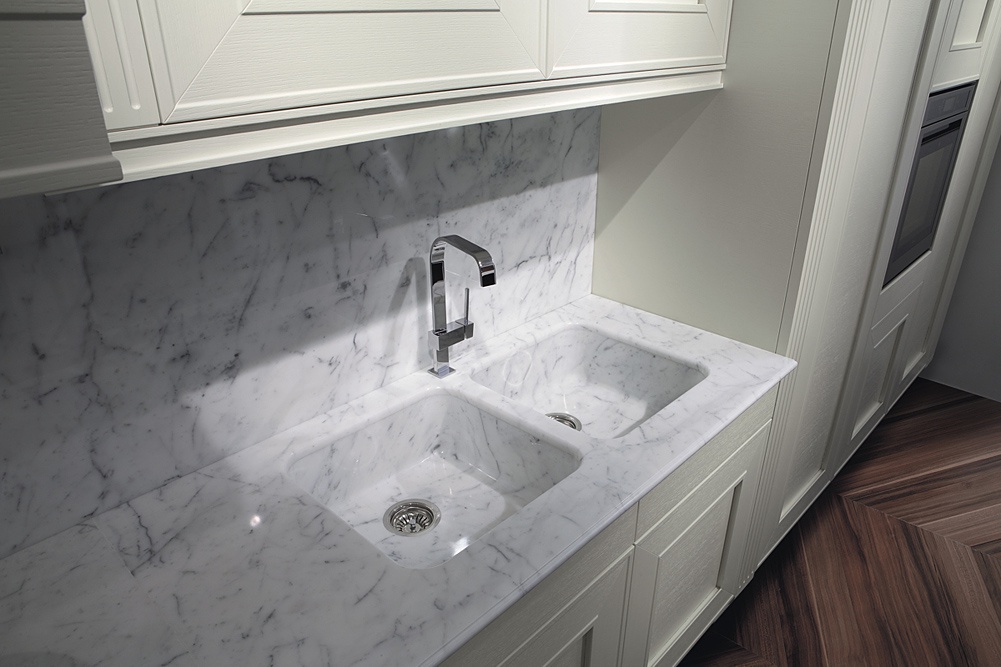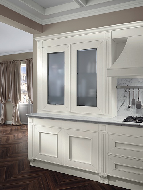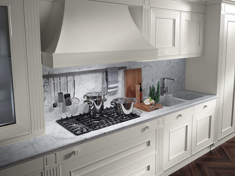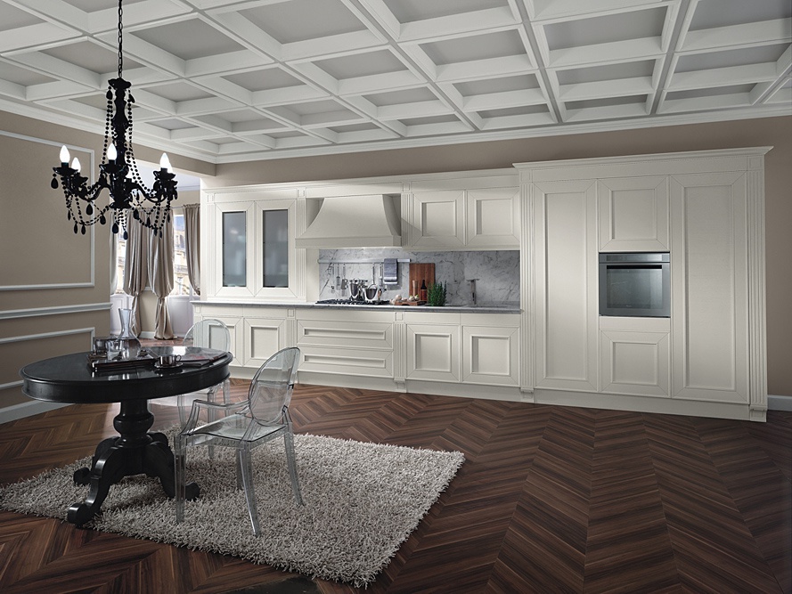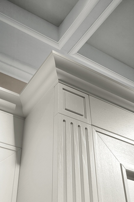 Melograno kitchen by Italian manufacturer Composit. Set goes beyond the classic concept in favor of a new expression on the basis of design and decor: pilasters insert (12 cm) available in different height for the base, sections and columns. Set includes two sinks. Completes the whole composition of the upper cornice, the hood with portal classical form, buffet with glass strings. Finish - white Matt lacquer from the company portfolio.