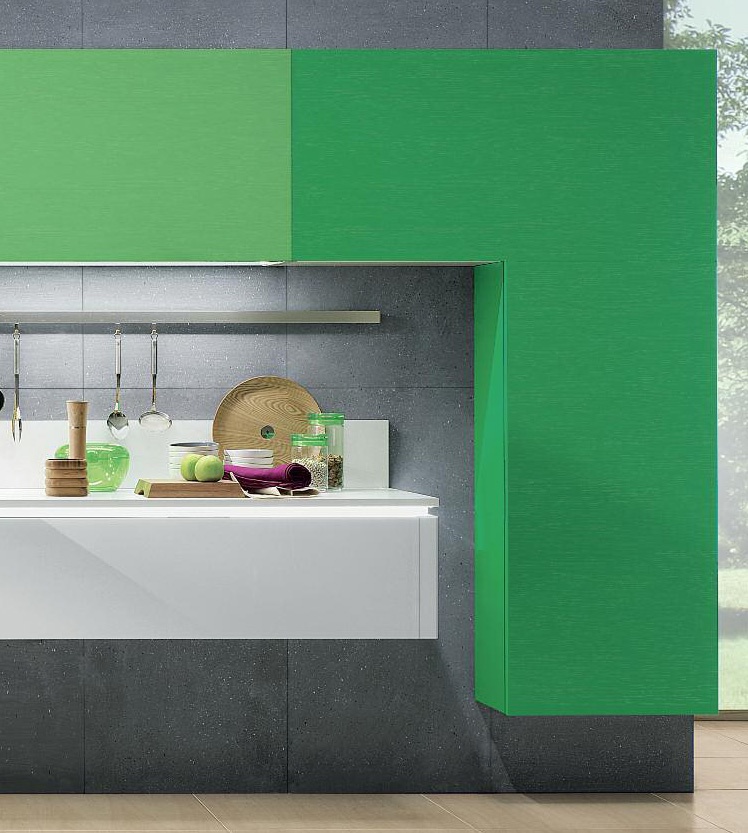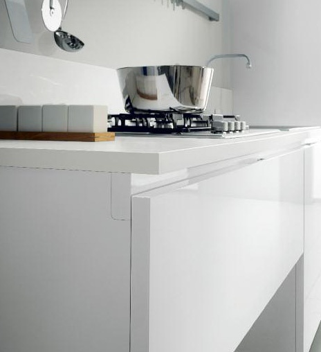 Kitchen set, Mya from the Italian manufacturer Composit. Stage design led lighting under the table top shows the character of the food. Set is made with a wide working surface. Recessed door handle. Worktop and the burners are suspended on the base, shell – on basis with the Foundation. Finish - high gloss laminate. The model is made in a modern style