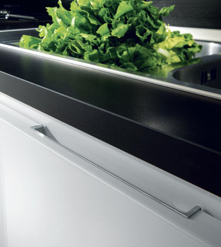 Handles in a chrome finish hidden in the thickness of the door or drawer. Horizontal and vertical grooves designed for ease of mount on the handle. The model includes closed and open sections with shelves for wine. Over the sink and burners are holders for objects. Finish – high gloss laminate. The model is characterized by a contrast color of the countertop and closed sections.