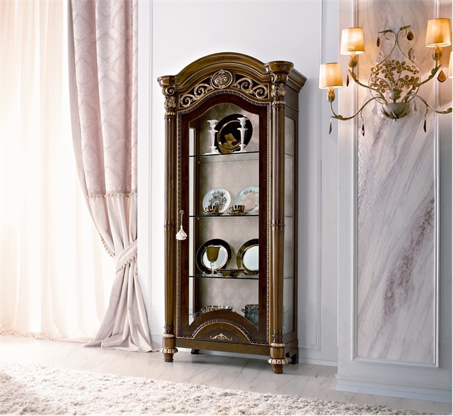 Showcase from Italian manufacturer Valderamobili. The model is made from maple wood, root veneer with alder, Myrtle and padauk. Decoration gold leaf is made manually. Door and glazed side panel. The model is equipped with internal lighting. Showcase with one door made in the style of the era of Louis XVI.