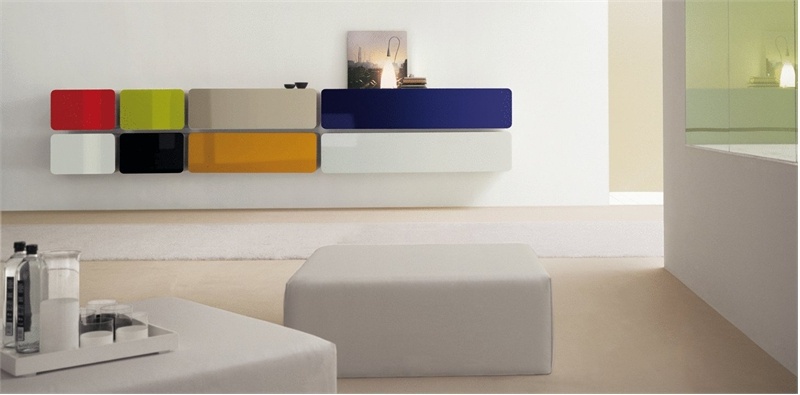 Modular system from Italian manufacturer Bimax. The model includes overhead boxes. Each drawer is equipped with a hinged door. The system is made of glass. Finishing with varnish is offered in different colors. The modular system is manufactured in contemporary style.