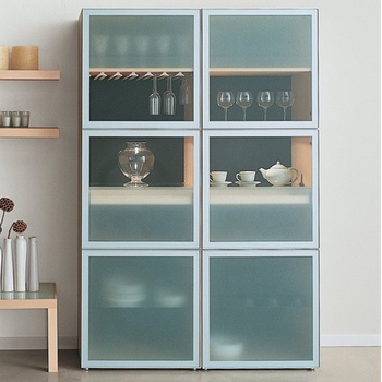 Showcase with glass doors (Horm). Can be any height and configuration depending on the combination of modules. Additional decoration is a colored inner surface and a door covered with a textured lacquer. Concise showcases will beautify the dining room or kitchen.