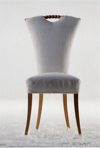 Chair with high back LUIGIA from the Italian manufacturer Giovannetti. Model on a frame of wood. Seat and back upholstered in fabric. The model without armrests. The adornment is a necklace Luigia. The model is made in modern style.