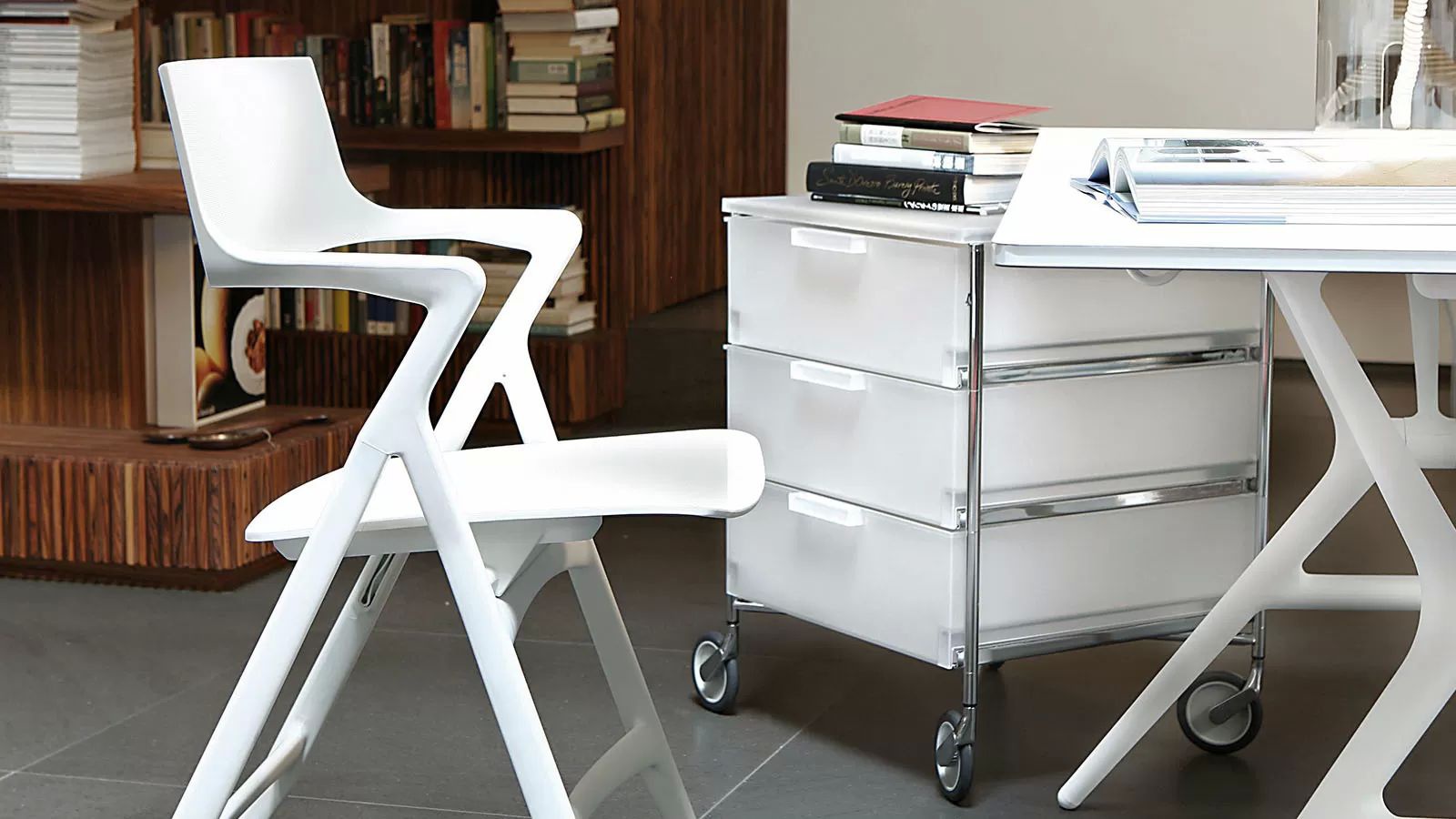 Chair with armrests Dolly from the Italian manufacturer Kartell. Model easy to fold. The frame is made of fiberglass. The seat is made of wood. Finishes bright and dark colors. The model can be used both at home and in the office. Manufactured with the latest technology.