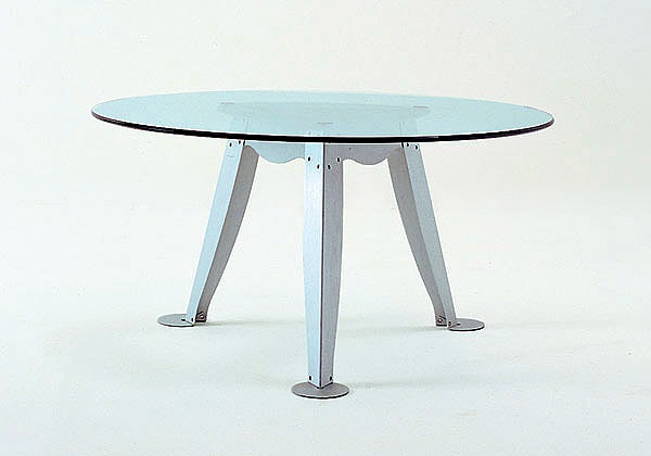 Liberta dining table from Italian manufacturer Meritalia. Desk on a frame of painted aluminium sheets of different colors in Matt finish. Round or triangular table top from transparent glass. The table is designed in modern style.