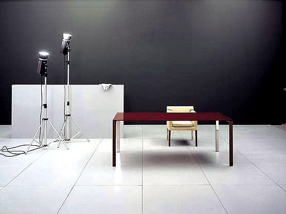 Table Tavoli Chic from the Italian manufacturer Meritalia. Desk on a frame of polished metal in the veneer finish. Table top in lacquered glass. The table is designed in modern style.