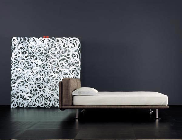 Bed Romeo from the Italian manufacturer Meritalia. A bed on a frame of steel tubes. Headboard from MDF. Upholstery made of leather or textile. The covers of leather or fabric with a buckle. Chrome or painted metal legs. Mattress base made of beech slats. The bed is designed in modern style.