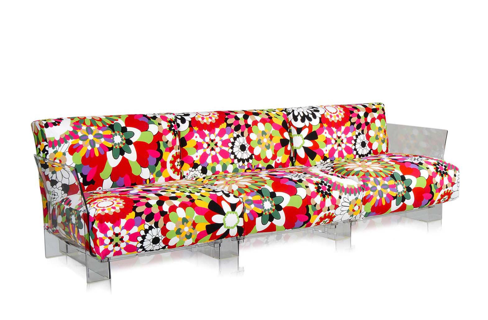 Pop three seater sofa from Italian manufacturer Kartell. The model is made on a frame of polycarbonate. Upholstery textile in from a range of companies. The cushion filling is foam. A model with a waterproof pad, for use on the street. The model is made in modern style.