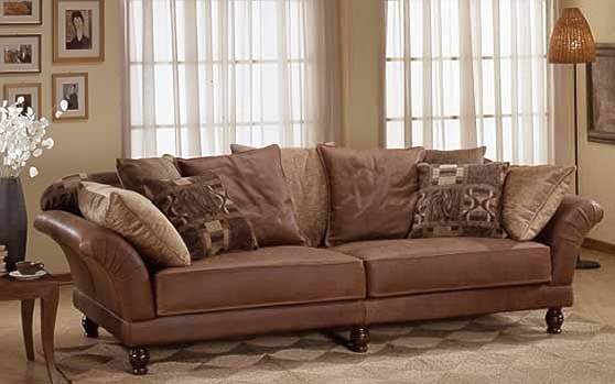 Sofa with low backrest and armrests rejected to the outside (Goldconfort), Due to the variety of textures and colors, the sofa will adorn any living room. The comfort of the sofa betray elastic straps and decorative pillows under the back.