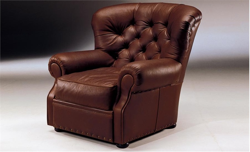 A chair with a wide backrest with ears and armrests cushions (Goldconfort). The model is decorated decorative stitch Capito on the back and furniture nails on the perimeter of the base. The chair will add to the ambience of your living room.