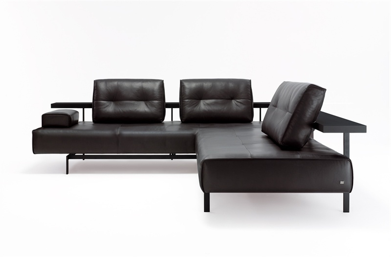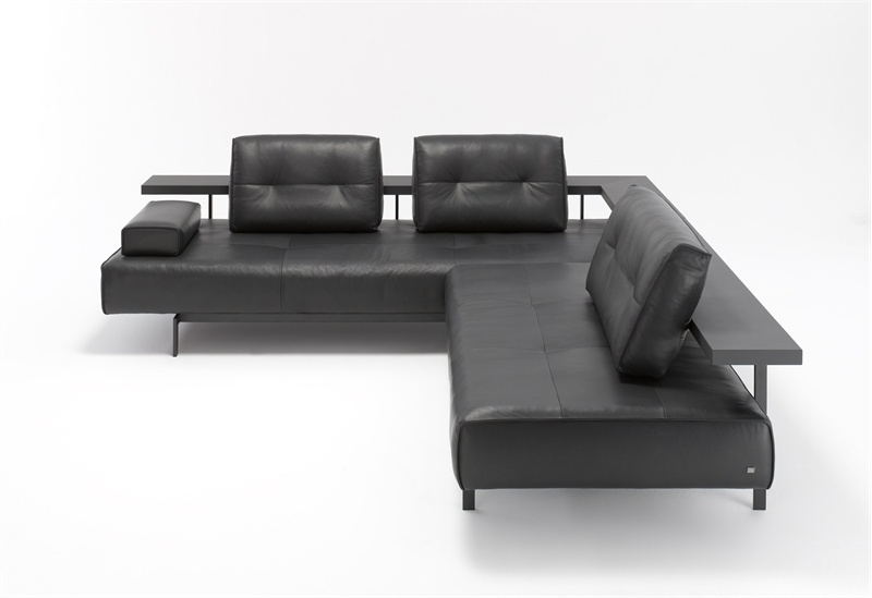 Sofa from the German manufacturer Rolf Benz. Corner modular sofa. The frame is painted black metal. The seat on a frame of wood is pushed forward. The model is offered in leather or fabric from the collection company. The sofa is designed in modern style.