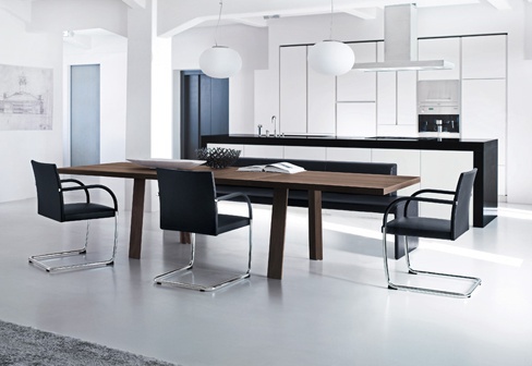 Dining table Tadeo, from the German manufacturer Walter Knoll. The legs are made of solid wood or aluminum. An additional tab is in the center under the table top. Dining table-transformer is made in a minimalist style.