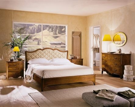 The superiority of the nut expressed in this bedroom, where strict game inlaid accompanied by the soft forms, such as a headboard, chest of drawers, dressing table and bedside tables, which are characterized by a curved facade.