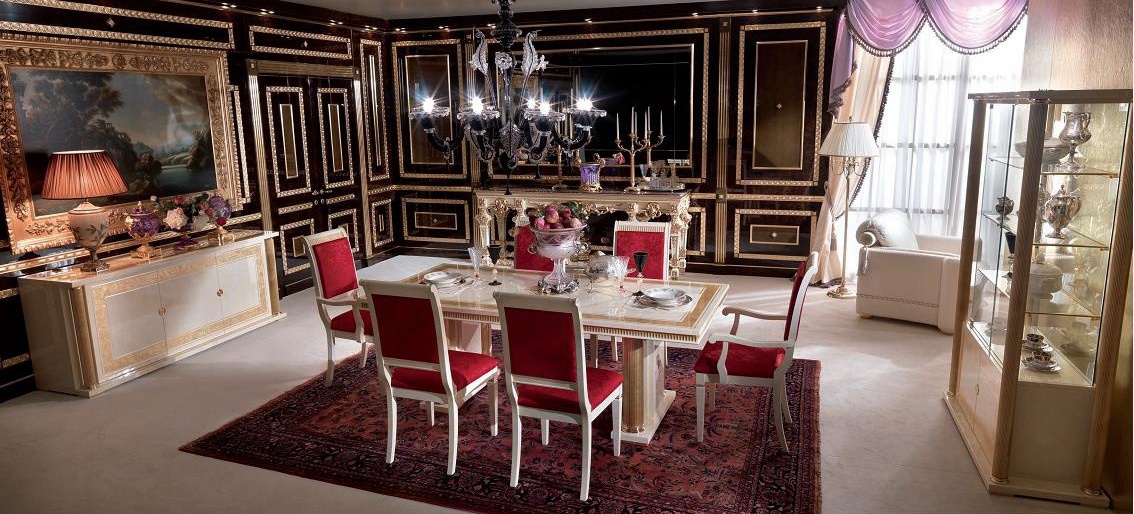 The Magna Plus dining table by Italian manufacturer Turri. Wooden structure, hand decorated, gloss polyester finish beige carved wood root decorative stripe of gold foil. Rectangular table is distinguished by decorative columns.