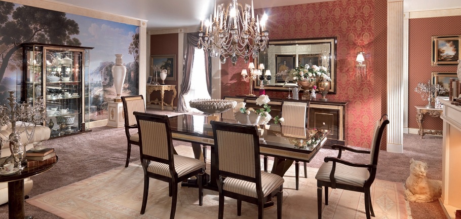 The Royale Arcade dining table from the Italian manufacturer Turri. The frame is made of wood. The handmade decor. Finish - gloss polyester, dark brown with a pattern of tree root. Rectangular table perfectly complement the classic interior of the living room.