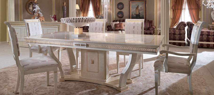The Royale Arcade dining table from the Italian manufacturer Turri. The frame is made of wood. The handmade decor. Finish - gloss polyester, in ivory with a pattern of tree root. The product is made in a classic style, a perfect choice for the dining room.