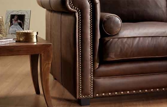 Sofa in classic style with low armrests (Goldconfort). Upholstery leather with decorative stitching, armrests cushions, decorated with an edging of furniture cushions, this "late" design is suitable for any office.