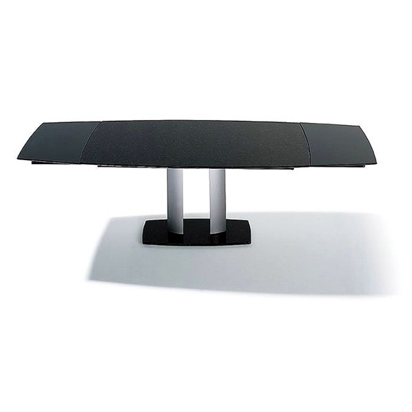 Dining table from German manufacturer Ronald Schmitt. Dining table-transformer with two extra tops. Main top is made of stone, and the extension made of MDF, covered with colored lacquer. Two legs aluminium lacquer surface mounted on a support made of metal or stone. The table is designed in modern style.