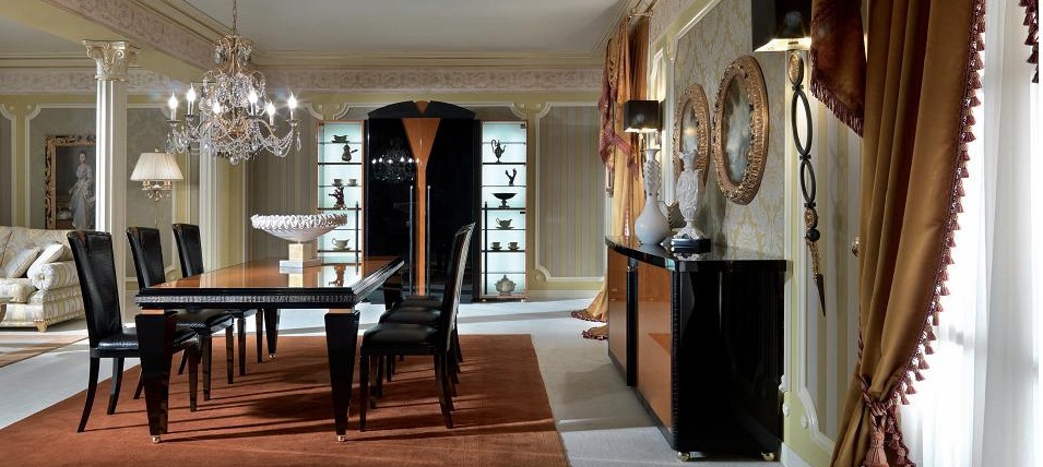 Century dining table from the Italian manufacturer Turri. The frame is made of wood. The handmade decor. Finish - gloss polyester, color Myrtle and black lacquer from the company portfolio. Massive top supported on figured legs. Will perfectly complement the dining room.