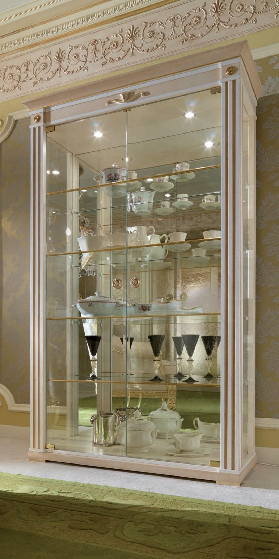 Showcase Exedra from the Italian manufacturer Turri. The frame is made of wood. The handmade decor. Finish - matte corrugated, powder colors on a brown background. Glass doors are made with decorative engraving. Internal glass shelves with decorative brass profiles. The back wall is mirrored. Showcase is made in the classic style.