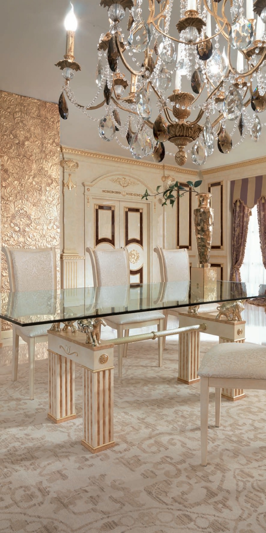 The Exedra dining table from Italian manufacturer Turri. The frame is made of wood. The handmade decor. Finish - matte corrugated, gold-plated color ochre with ochre stains. The faceted table top is made with rounded corners. Wooden decorative details in antique gold. Sculptures made of brass coated with lacquer at high temperatures. The product is made in a classic style, perfectly complement the living and dining room.