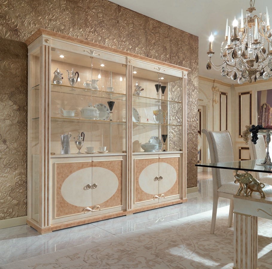 Showcase Exedra from the Italian manufacturer Turri. The frame is made of wood. The handmade decor. Finish - matte corrugated, gold plated color with splotches of ochre. Wooden doors in the lower part and glass doors with decorative engraving at the top. Internal glass shelves made with decorative brass profiles. Showcase with 4 doors perfectly complement the classic interior.