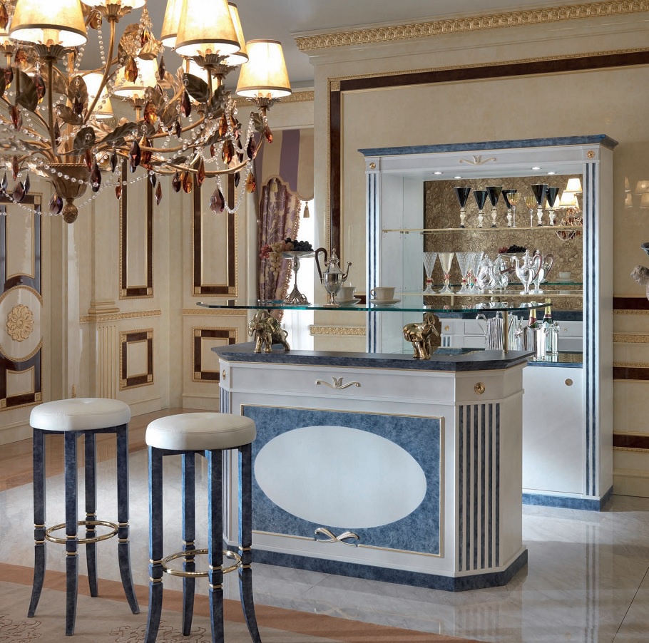 Exedra bar stool from the Italian manufacturer Turri. The frame is made of solid wood. Seat upholstered, leather upholstered. The handmade decor. Finish - matte blue corrugated. The legs are connected by pronaoi. The model will perfectly complement the classic interior of dining room, living room.