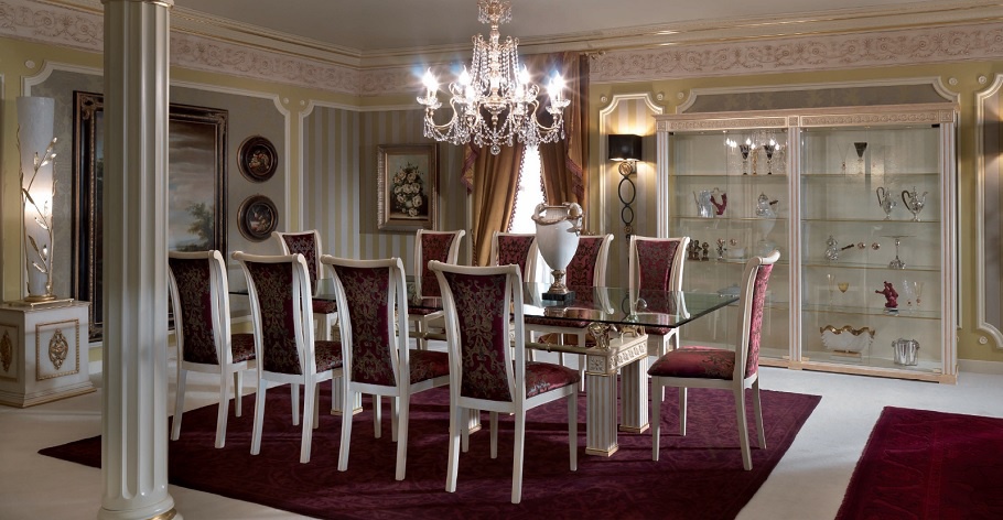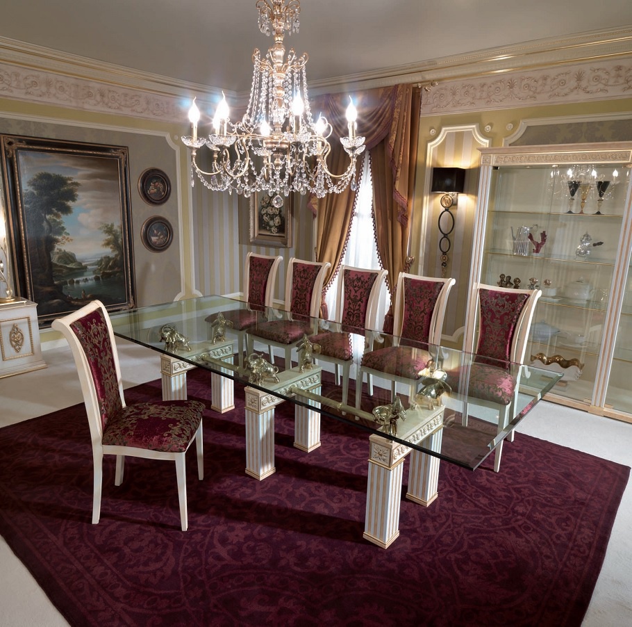 Dining table Exedra Gold from the Italian manufacturer Turri. The frame is made of wood. The handmade decor. The finish is a matte crepe, salmon color with salmon in divorce. The crackle glass tabletop is made with rounded corners. Decorative wooden profiles with the aged gold finish effect. The sculpture is made of brass with lacquered finish processed at high temperatures. The product of classic design perfectly fit into the dining room, living room.
