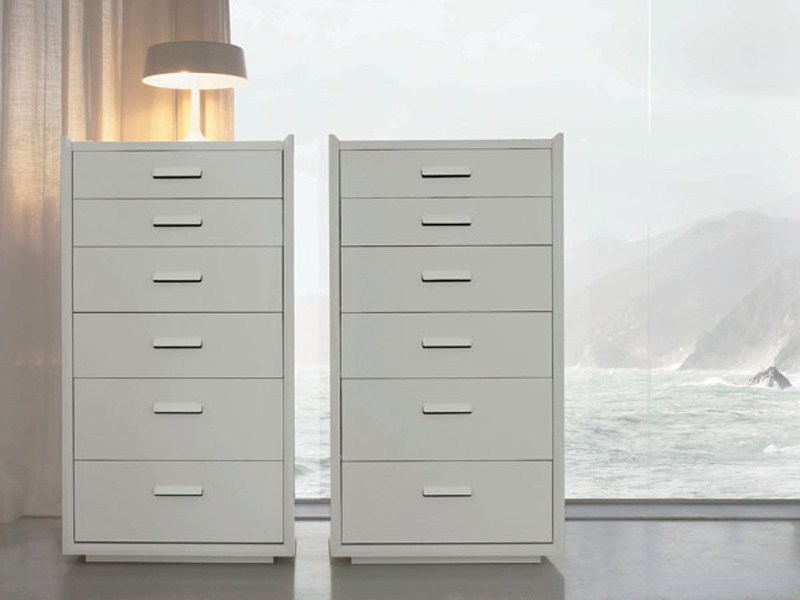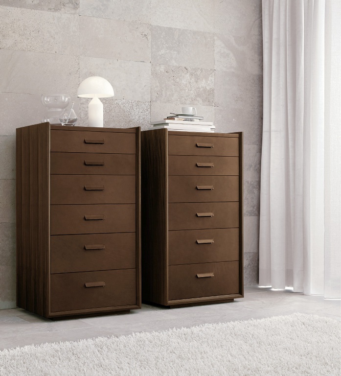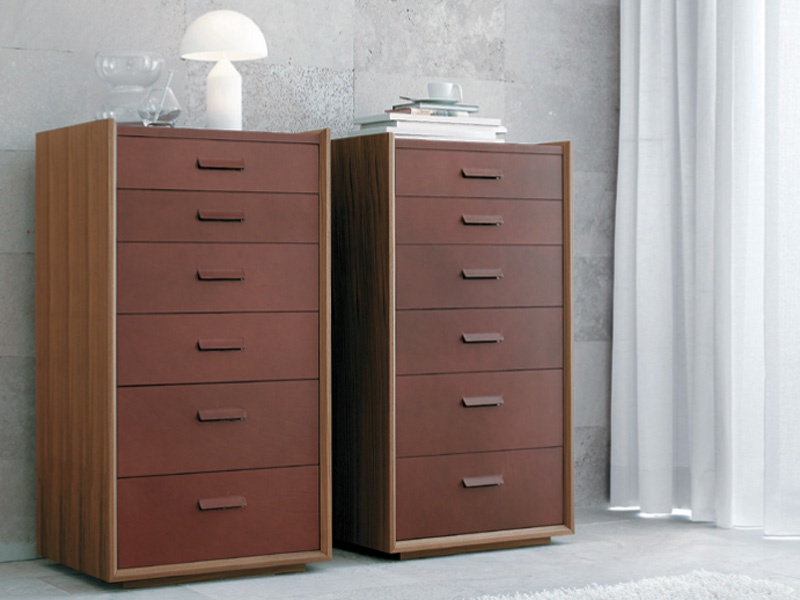 The Fjord chest of drawers from Italian manufacturer Alivar. The sides are made of oak or lacquered MDF. Drawers with wooden handles and a leather upholstered top. The choice of color in stock.