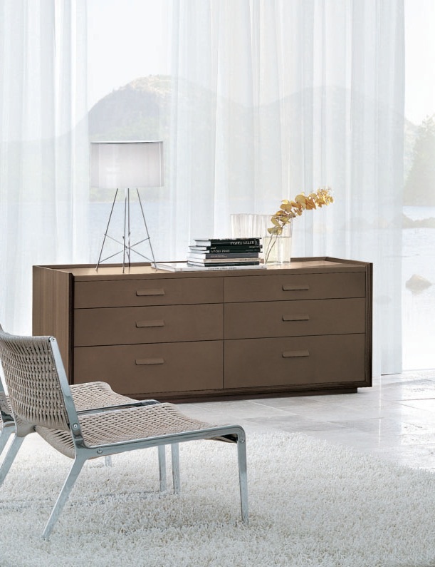 The Fjord chest of drawers from Italian manufacturer Alivar. The product is made from oak wood or lacquered MDF. Drawers with wooden handles and a leather upholstered top. The choice of color in stock.
