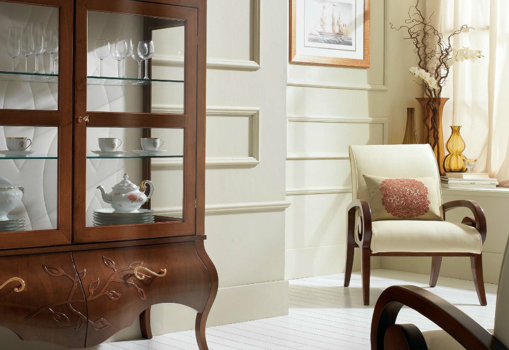 The armchair from the Italian manufacturer at the stilema stand. Model made of solid wood. The armrests are rounded off. The upholstery is leather. Finish beige color. The model is made in classic style.