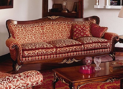The Canape sofa from Italian manufacturer Minotti Luigi & Benigno. Three seater sofa with carved shaped back and armrests. Model in the classic style. Frame made of solid wood with decorative elements in the decoration of gilding. Supplemented with soft seat cushions. Upholstery textiles.